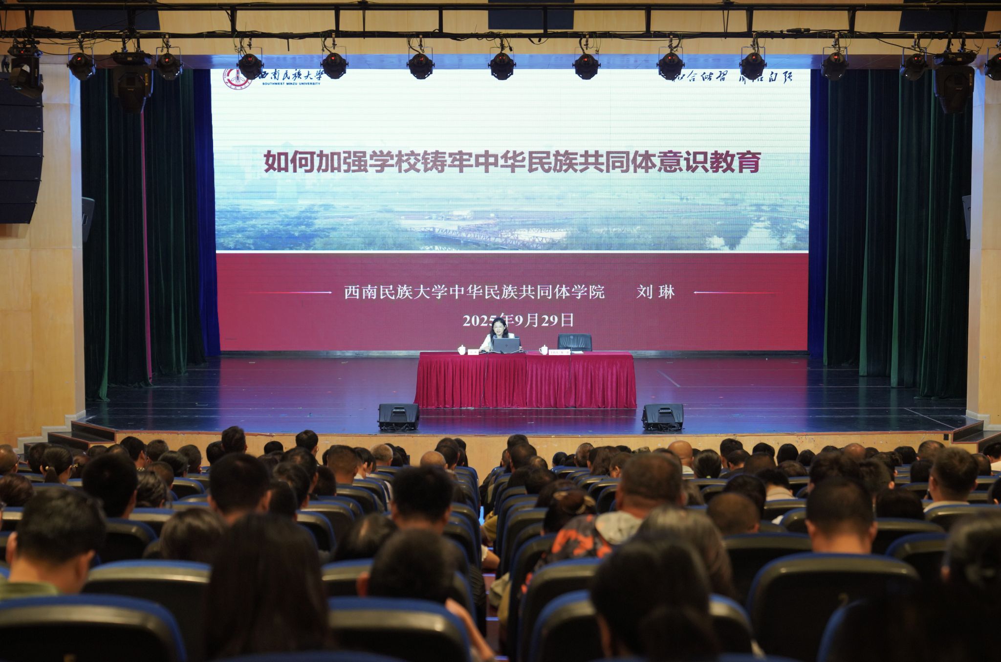 刘琳以《如何加强学校铸牢中华民族共同体意识教育》为题,围绕“为何教”“教什么”“怎么教”三个问题,深刻阐释了学校铸牢中华民族共同体意识教育的重大意义、丰富内涵和时代价值,精准解读了新时代党的民族工作的主线、方针政策和实践要求。特别是结合高校立德树人的根本任务,就如何将铸牢中华民族共同体意识教育融入办学治校、教育教学、人才培养全过程,提出了具有前瞻性和可操作性的思考和建议。她强调,铸牢中华民族共同体意识是新时代党的民族工作主线,高校需将其融入立德树人全过程,培养担当民族复兴大任的时代新人。要高举爱国主义和民族团结旗帜,增强使命担当,强化“五个认同”,不断增强中华民族共同体意识,切实推进中华民族共同体建设。