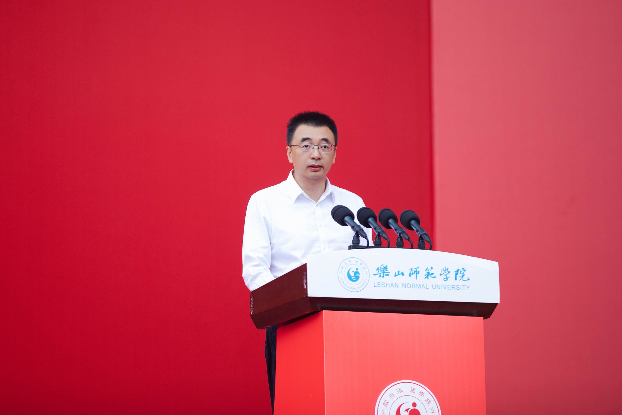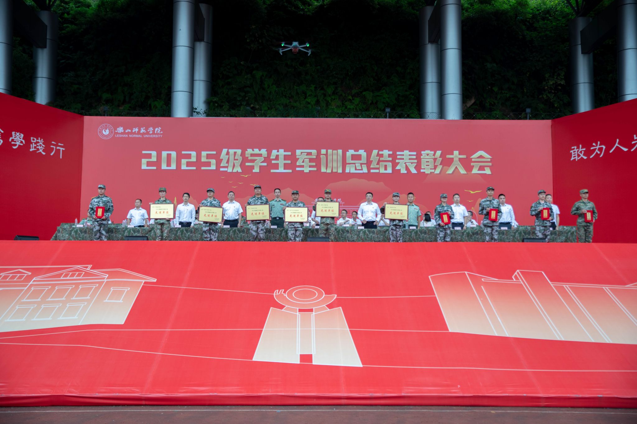 本网讯(文图/融媒体中心)金秋九月,硕果盈枝。9月30日,我校2025级学生军训总结表彰大会在北校区田径场举行,4900余名参训学生用14天的汗水与坚持,交出了入学后的首张青春答卷。学校党委书记、军训领导小组组长刘进,党委副书记、校长、军训领导小组组长李方裕,乐山军分区动员处上校处长王光明,武警乐山支队中校参谋长石彦斌,校党委副书记、纪委书记彭尚源,校党委副书记陈一君、校党委常委、副校长汪天飞、江滔、农向等出席大会。校党委常委、副校长、军训领导小组常务副组长李朝晖主持大会。