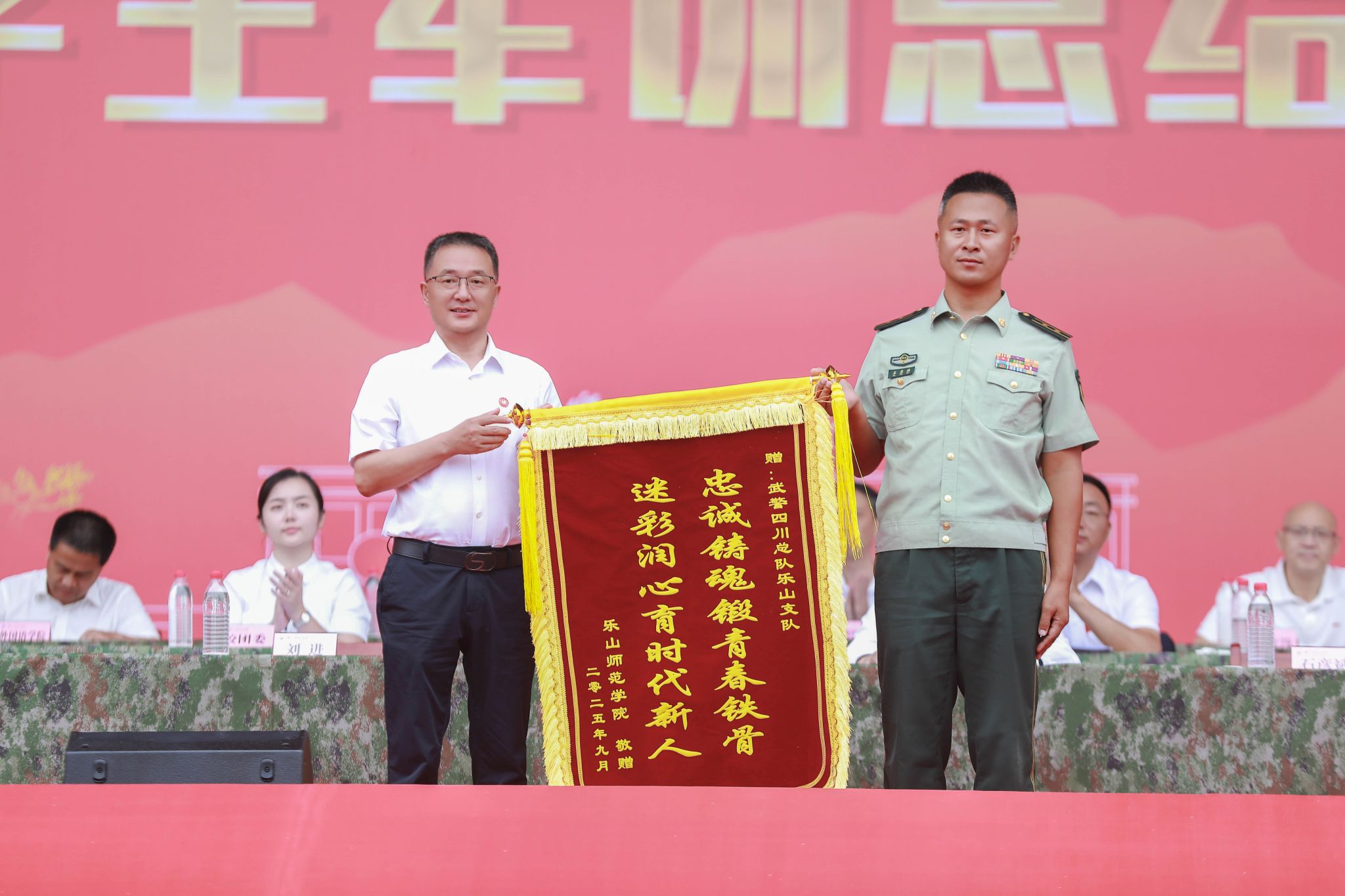 大会上,刘进向武警乐山支队赠送锦旗。