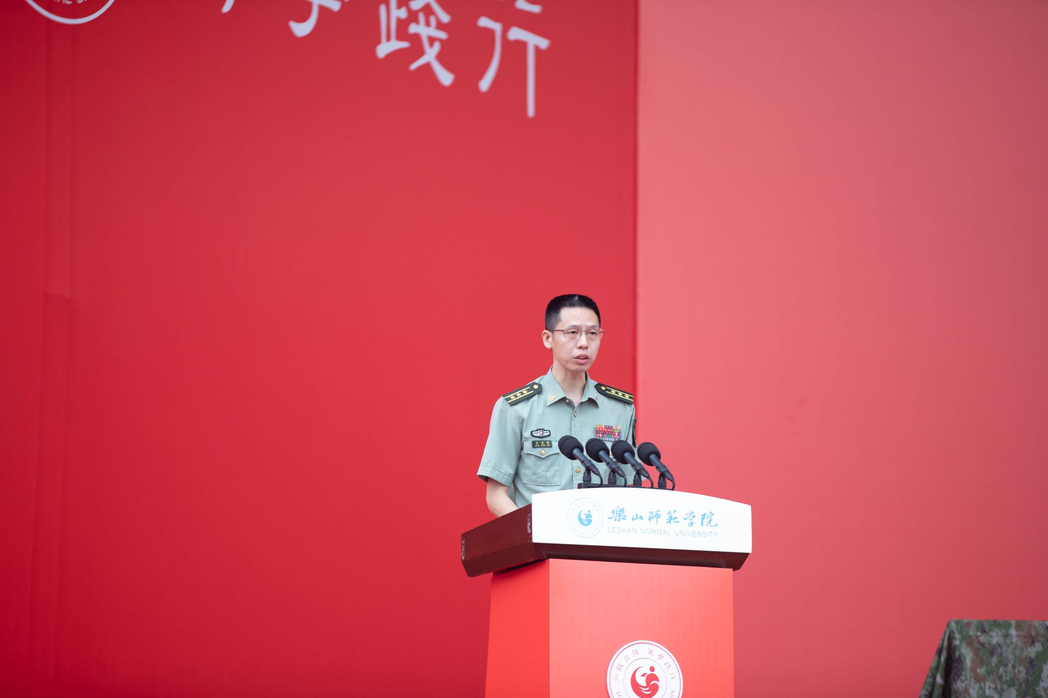 王光明代表乐山军分区对2025级学生军训任务的圆满完成、精彩的汇报表演表示热烈祝贺。他指出,此次汇报表演全面展现了乐师学子朝气蓬勃、昂扬向上的青春风采,体现了勇于吃苦、挑战自我的过硬作风。他希望同学们要存报国之志,为实现中国梦而奋斗。要立拼搏之气,为实现强军梦而奋斗。要惜成才之机,为实现人生梦而奋斗。