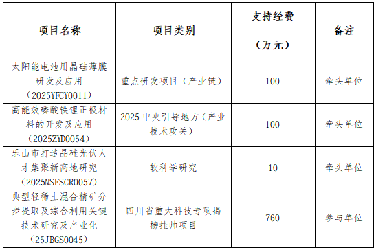 本网讯(文图/张钰林)近日,四川省科技厅2025年度省级科技项目立项工作陆续落地,我校乐山西部硅材料光伏新能源产业技术研究院(以下简称“硅研院”)再传捷报,成功斩获4项省科技厅项目,涵盖重大科技专项、产业链重点研发、产业技术攻关及软科学研究四大类别,以硬核科研实力精准对接国家 “双碳” 战略与四川 “十五五” 发展部署,为区域新能源产业高质量发展注入强劲高校动能。