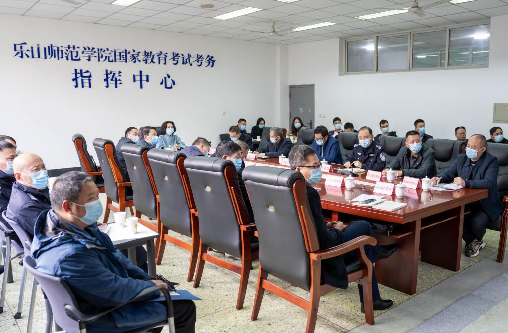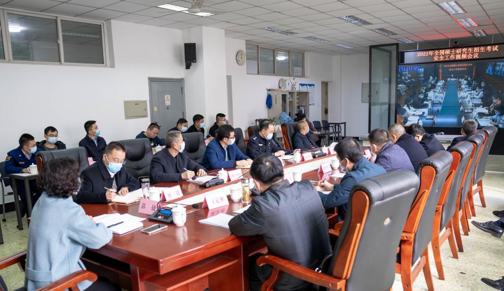 本网讯(文、图/孟繁增)2022年全国硕士研究生招生考试将于12月25日至27日举行。11月18日,2022年全国、全省硕士研究生招生考试安全工作视频会议召开,乐山市委常委、副市长、市招考委主任郭捷,市教育局局长成定彬以及市级相关部门负责人,学校党委副书记、校长刘进,校党委常委、副校长汪天飞以及学校相关部门负责人参加会议。