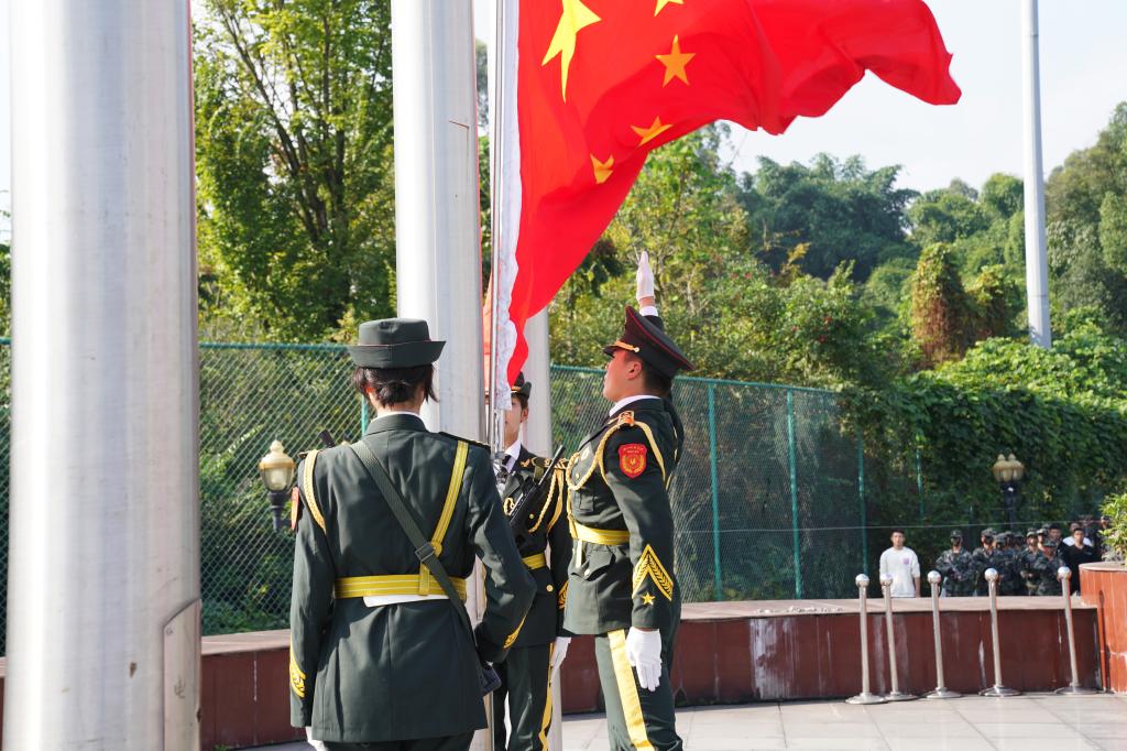 升国旗、奏唱国歌。一声号令,迎团旗。分列式正式开始!伴随着中国人民解放军军歌的激昂旋律,25个连队组成的方阵踏着整齐的步伐以最饱满的热情,最挺拔的身姿,最有力的口号,昂首阔步走过主席台接受检阅。