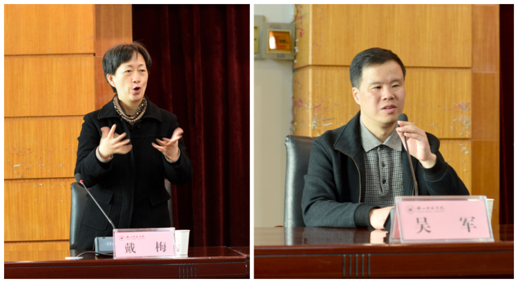 戴梅、吴军先后发言,他们感谢四川省残联、乐山师院对全省聋人、盲人朋友的关爱、支持与帮助,本次培训班暨论证会的举行,是上下高度重视并克服各种困难的结果。希望各位学员充分认识到本次培训和论证的重要性,以认真负责的态度,积极参加学习讨论,在学习中互帮互助,共同进步。各位学员还要学以致用,不仅将学习到的国家通用手语和通用盲文的知识、技能运用于自身的学习、生活、工作之中,还要自觉承担起宣传推广手语和盲文的责任,做宣传推广的先行者、排头兵。