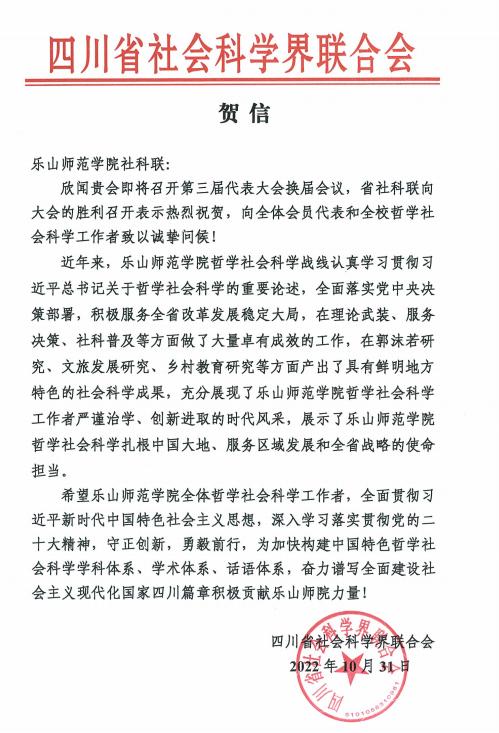 四川省社科联特地发来贺信,贺信中向大会的胜利召开表示热烈的祝贺,向全体会员代表和全校哲学社会科学工作者致以诚挚的问候!贺信充分肯定了我校社科联近年来在哲学社科领域取得的成果,希望我校全体人文社会科学工作者守正创新、再接再厉,以时不我待的勇气、舍我其谁的斗志,奋力开创新时代人文社会科学事业发展新局面,为打造具有中国特色、中国风格、中国气派的哲学社会科学贡献乐山师院力量!