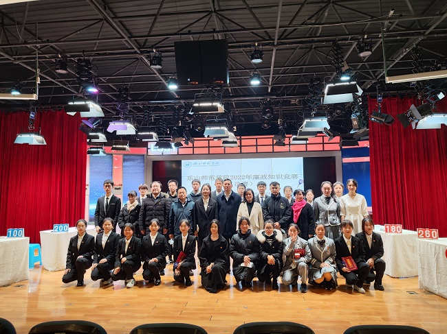 本网讯(文/何源 图/罗雅欣、李晨、刘倩)为贯彻落实党的二十大精神,推动我校纪律规矩教育,进一步增强全校学生纪律规矩意识,提高全校学生的廉洁自律意识,营造以文化人、以文润德、以文养廉的浓厚校园文化氛围。12月8日,乐山师范学院2022年廉政知识竞赛决赛在一教八阶举行。经过预赛、初赛,全校最终有8支队伍24名选手参加决赛。省纪委监委派驻乐山师范学院纪检监察组组长,学校党委副书记、纪委书记彭尚源,乐山师范学院纪委办主任邹大勇,马克思主义学院党委书记李涛,乐山师范学院纪委办副主任李谦,各二级学院党委副书记、纪检委员莅临指导。