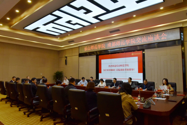 陈范华简要介绍了乐山师范学院高等教育办学45周年的办学历史和基本情况,并对学校在申硕过程中加强专业建设、科学研究、人才培养等方面的经验和做法作了交流。陈范华指出,成都师范学院与乐山师范学院是兄弟院校,希望两校以此次交流座谈为契机,在对标竞进、人工智能等方面拓展合作空间、深化合作领域,共同推进两校的高质量发展。李方裕对乐山师范学院的学科建设情况作了交流发言,他指出,学校坚持以学科建设为龙头,“三位一体”推进学位点、专业点建设,实施学科递进建设培育计划,明确“优先培育”“重点培育”和“加强培育”的学科建设梯次,在着力对标申硕学科建设方面取得了显著成效。希望两校围绕学科建设在队伍建设、机制建设、绩效考核方面深化交流与合作,共同研究、解决发展过程遇到的困难,实现互利共赢。
