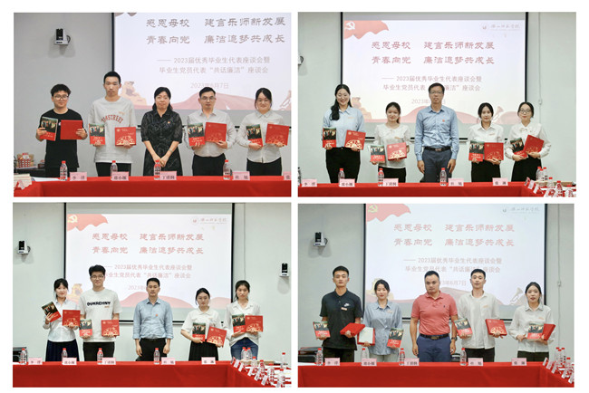 交流发言后,毕业生党员代表向学校领导赠送了精心制作的纪念品,领导们也向毕业生党员回赠了书籍《习近平与大学生朋友们》、《给年轻干部提个醒》及毕业纪念品。