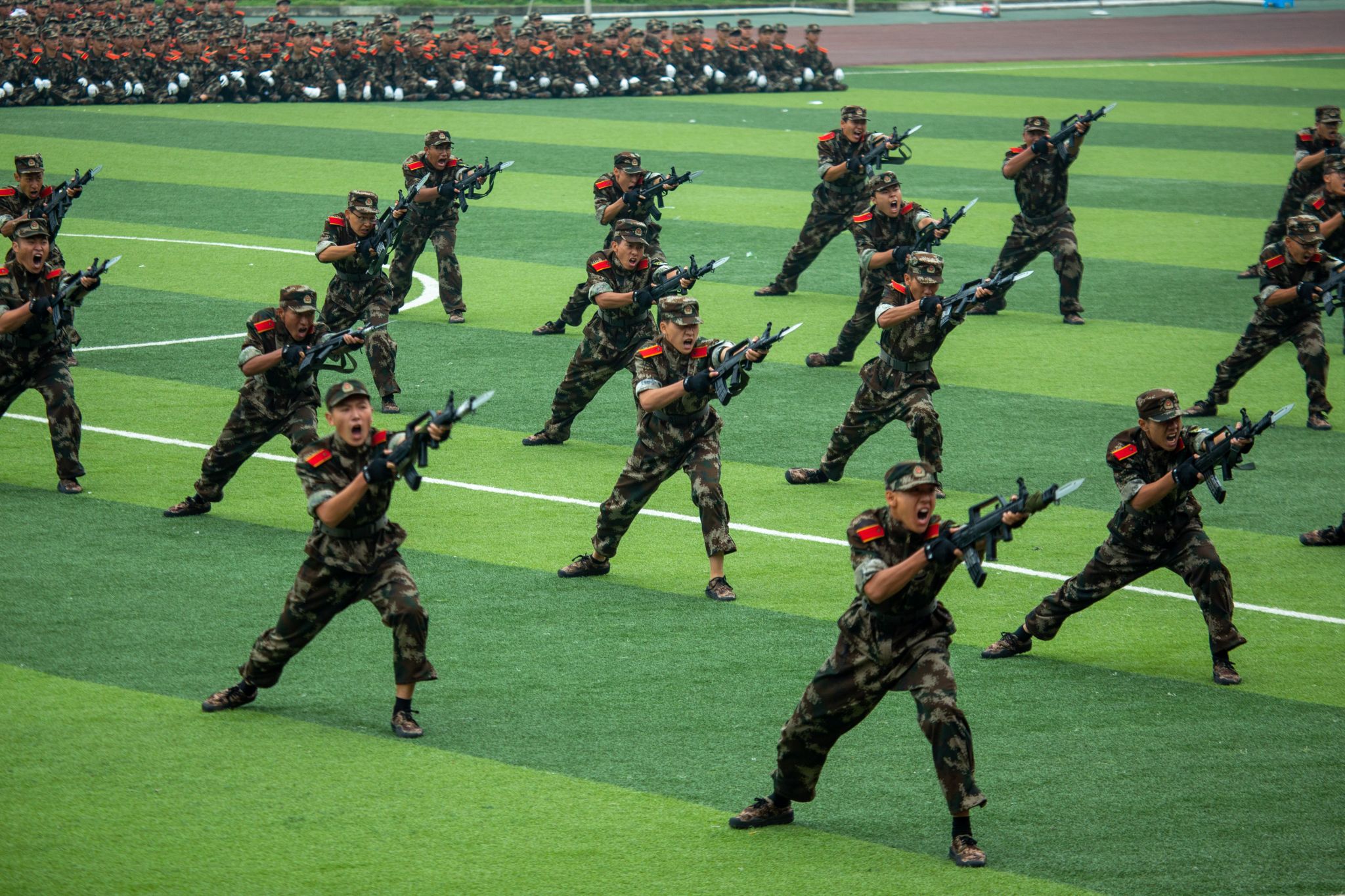 综合战术。操场上硝烟弥漫,警声环绕。滑跪,匍匐,卧倒,冲刺。转移伤员,近战肉搏,阵阵杀声,尽显乐师学子风采。