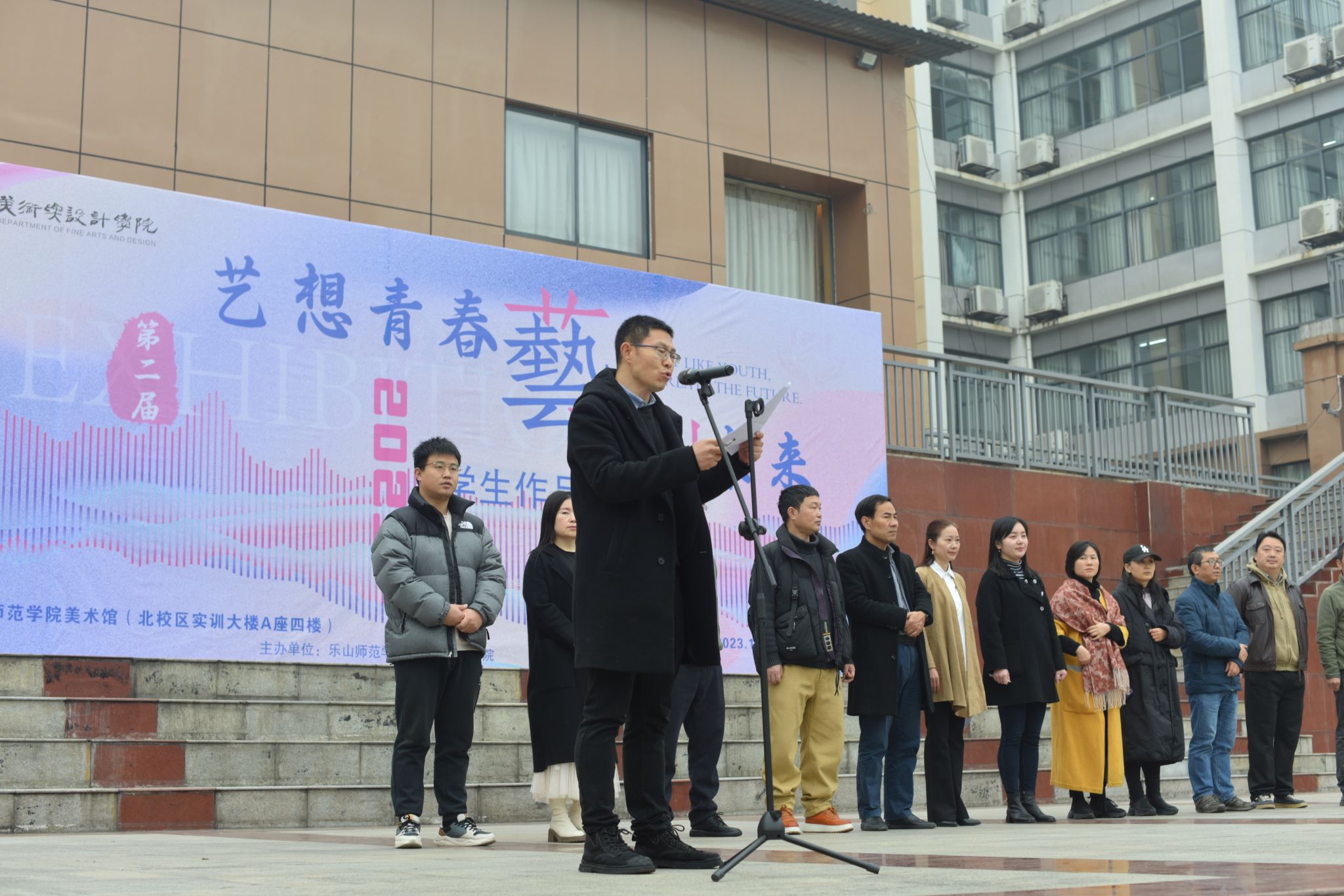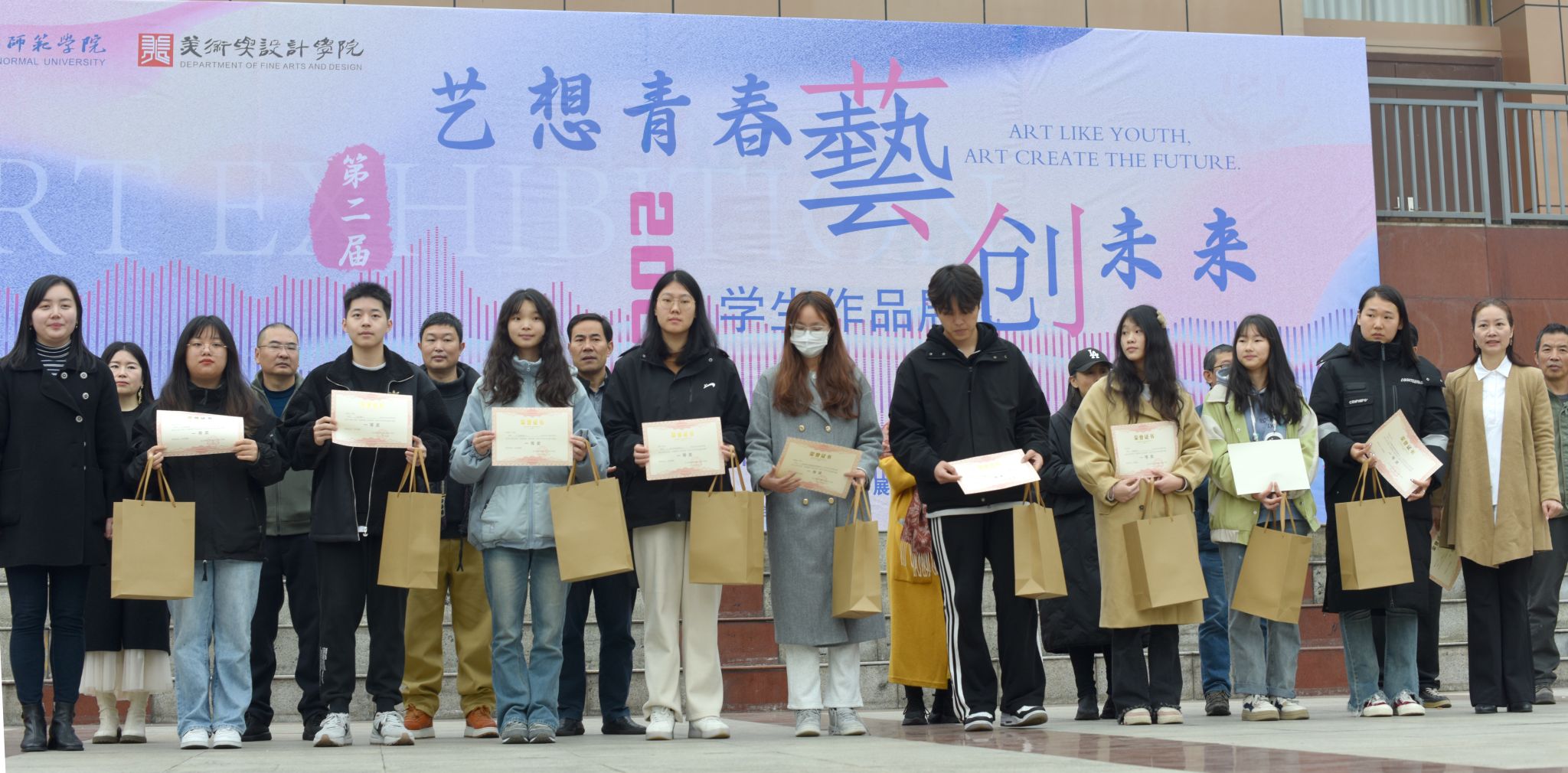 活动伊始,赵元说明了本次学生作品展的目的和意义,介绍了参加开幕式的领导、老师。开幕式上,王孝琴首先致辞,她对指导老师们表达了感谢,肯定了同学们为本次展览所付出的努力,希望同学们以此次展览为新的起点,努力提升专业素养,创作出更多优秀的作品。任素梅对本次展览作品进行了介绍,并宣读了获奖名单,希望同学们今后结合新时代要求,用多元的艺术手法,创作更多的优秀作品,为学校的艺术事业增添光彩。随后,学生代表2022级书法学2班刘沛同学在发言中对学校、学院为同学们提供的专业学习交流展示平台和学习资源表达了感谢,他表示本次展览为同学们提供了一个相互学习交流的平台,能进一步激发学生的学习热情和艺术创造力。最后,翟雅媛讲话并宣布学生作品展开展,表示美术与设计学院作品展不仅展示了专业学习成果,又搭建了美育教育平台,为全校同学提供了欣赏艺术美的机会。开幕式结束后,领导、老师和同学们一起合影留念并参观了展览。