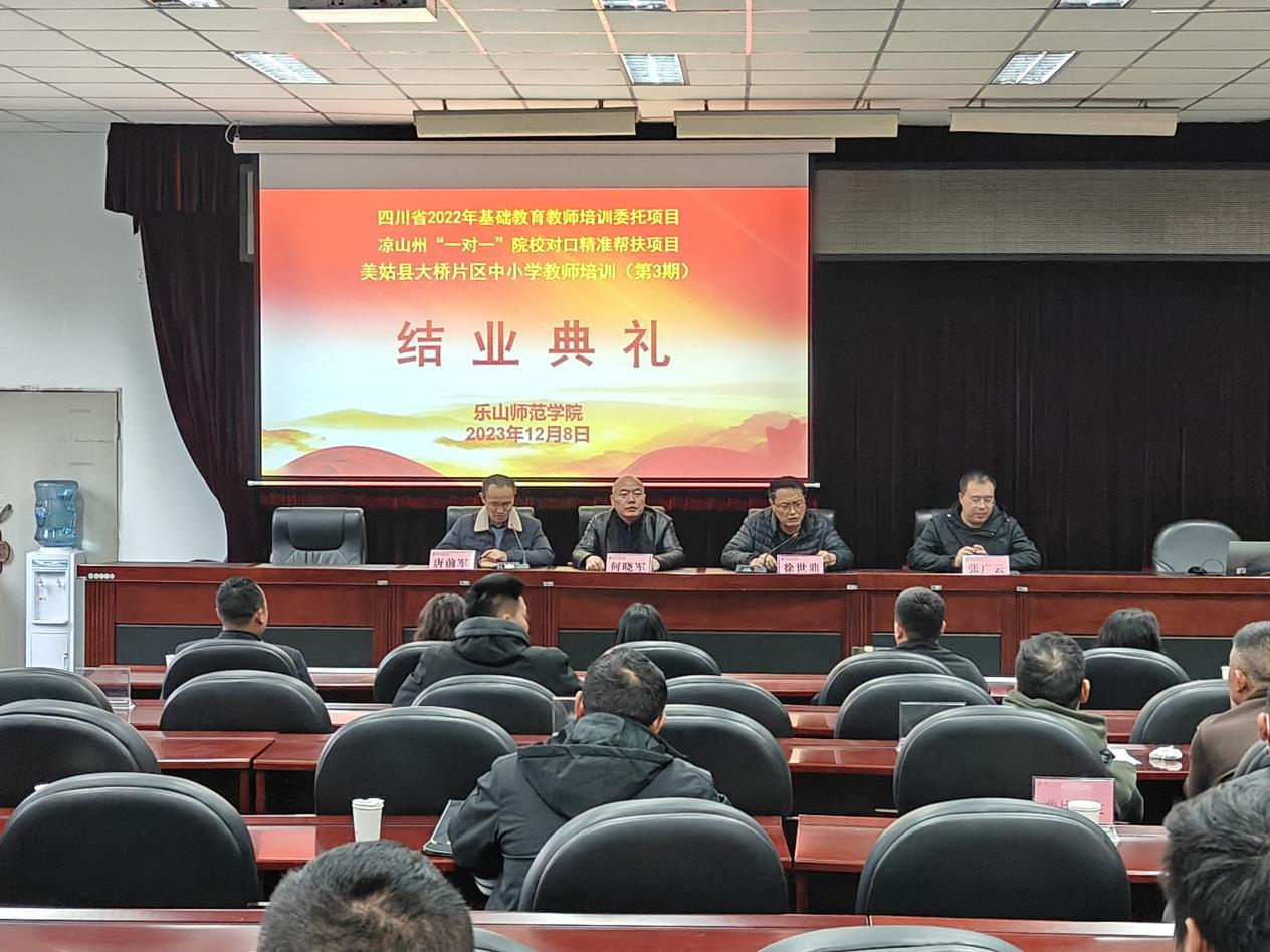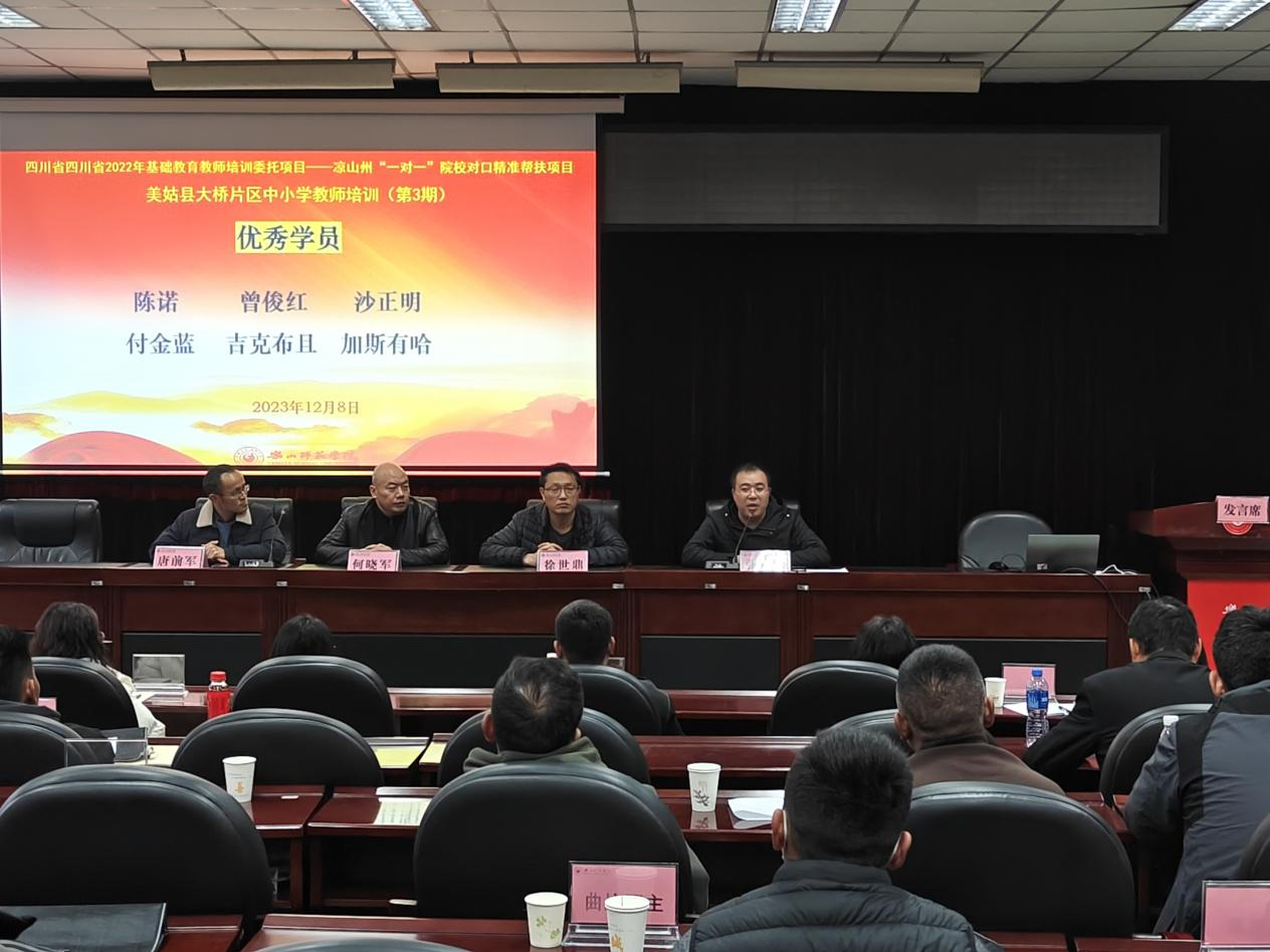 本网讯(文/何旭洋 图/何旭洋、蒲绍东)12月7日下午,四川省2022年基础教育教师培训委托项目——凉山州“一对一”院校对口精准帮扶项目(第三期)结业典礼在弘毅楼413进行。教育科学学院党委副书记何晓军,副院长徐世鼎,教师教育教研室主任张广云,赵增华、张源元及40名学员参加,结业典礼由副院长唐前军主持。