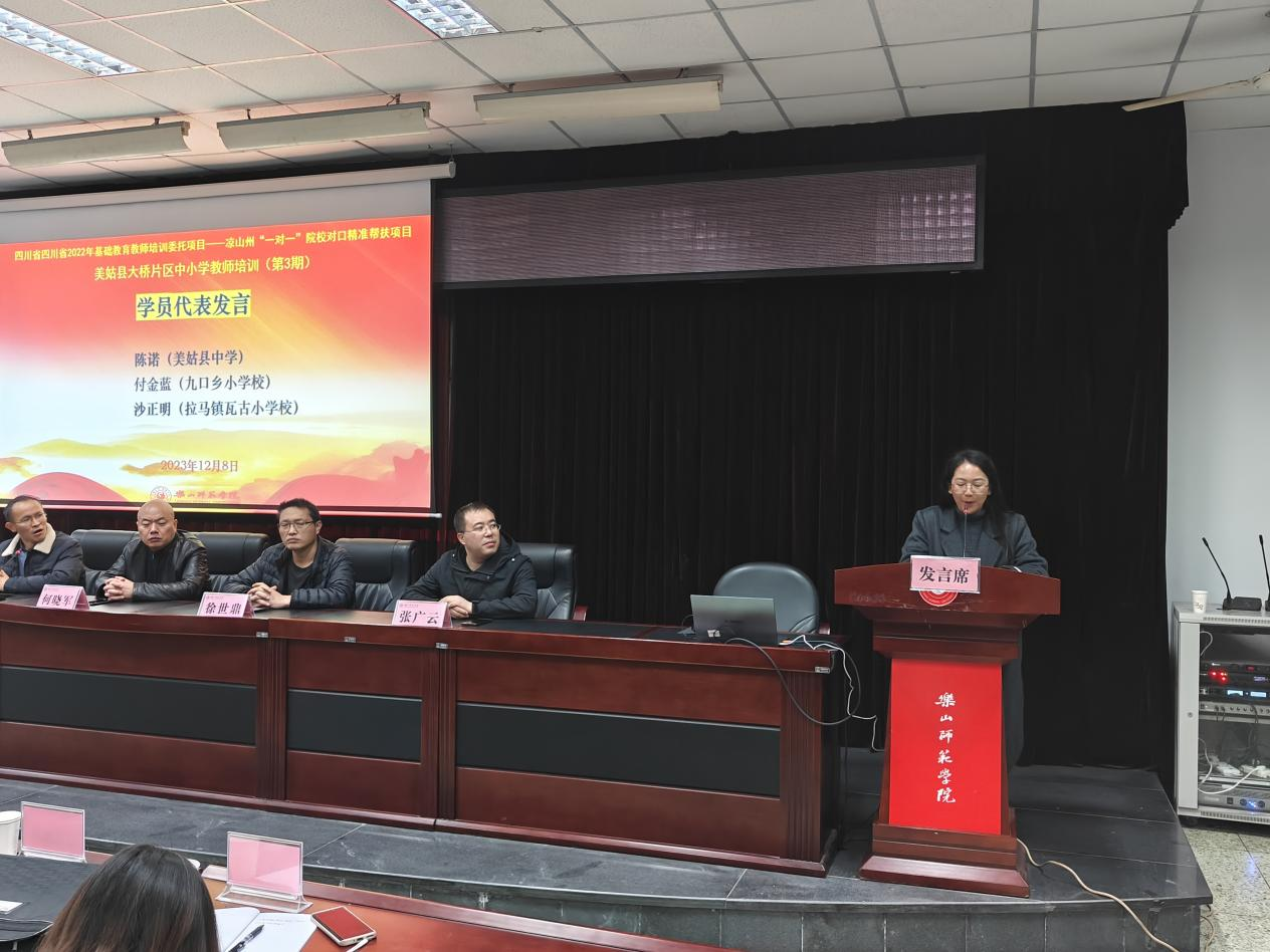 结业典礼上,三位来自不同学校的学员代表进行发言,他们表示在此次培训中均获益良多。他们在理论课程的学习中加强了理论修养,拓展了教育视野,更新了教育理念。4天的跟岗学习体会到不同学校,不同班级间授课、管理上的差别,提升了对教育教学,班级管理等的认识。来自美姑县九口乡小学的付金蓝老师说,教学有法,教无定法,惯在得法。要努力形成自己的教法,形成自己的特色,形成自己的风格,教出自己的风采。
