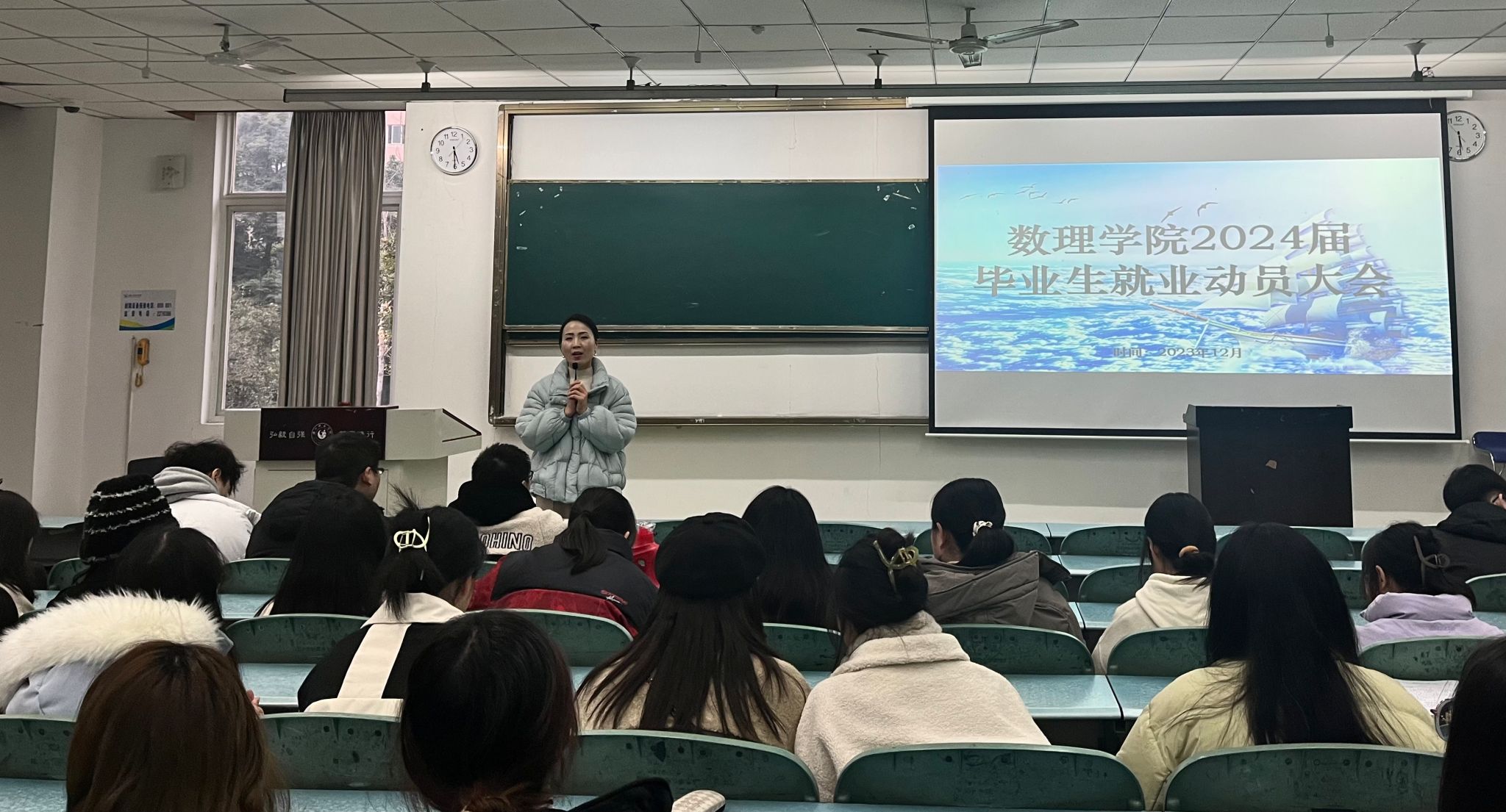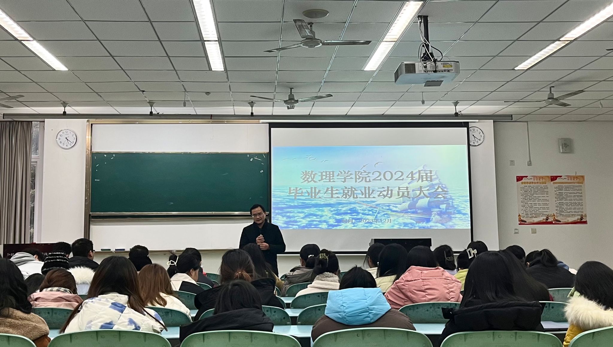 本网讯(文/欧坤焱 图/杨依林)为进一步落实教育部、四川省教育厅以及学校关于做好2024届普通高校毕业生就业创业工作的决策部署,帮助2024届毕业生深刻认识并分析当前的就业形势,数理学院于12月25日下午在行知楼101教室召开了2024届毕业生就业动员大会。数理学院党委书记马力强、院长屈小兵、党委副书记左莉、副院长于恩峰以及2024届毕业生参加,大会由毕业班辅导员廖宇主持。