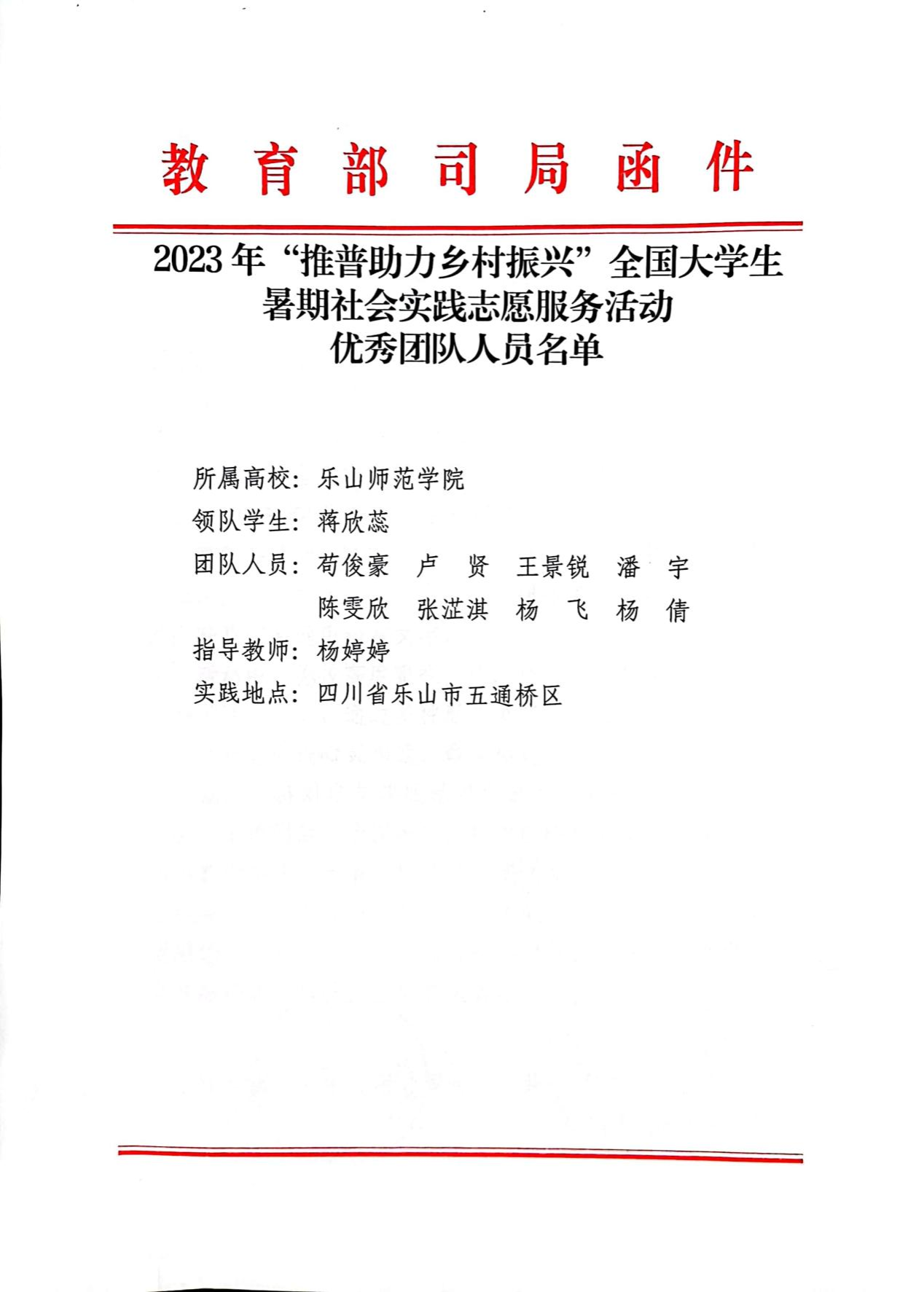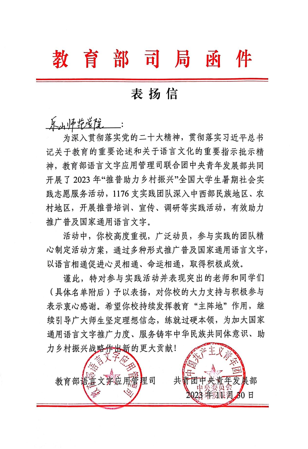 本网讯(文、图/杨婷婷)近日,教育部语言文字应用管理司、共青团中央青年发展部共同主办的2023年“推普助力乡村振兴”全国大中专学生暑期社会实践志愿服务活动评优结果揭晓,乐山师范学院“话童声嘹亮,结母语情深”乐芽推普助力乡村振兴服务队获全国“优秀团队”称号并获教育部语言文字应用司和共青团中央青年部来信表扬。