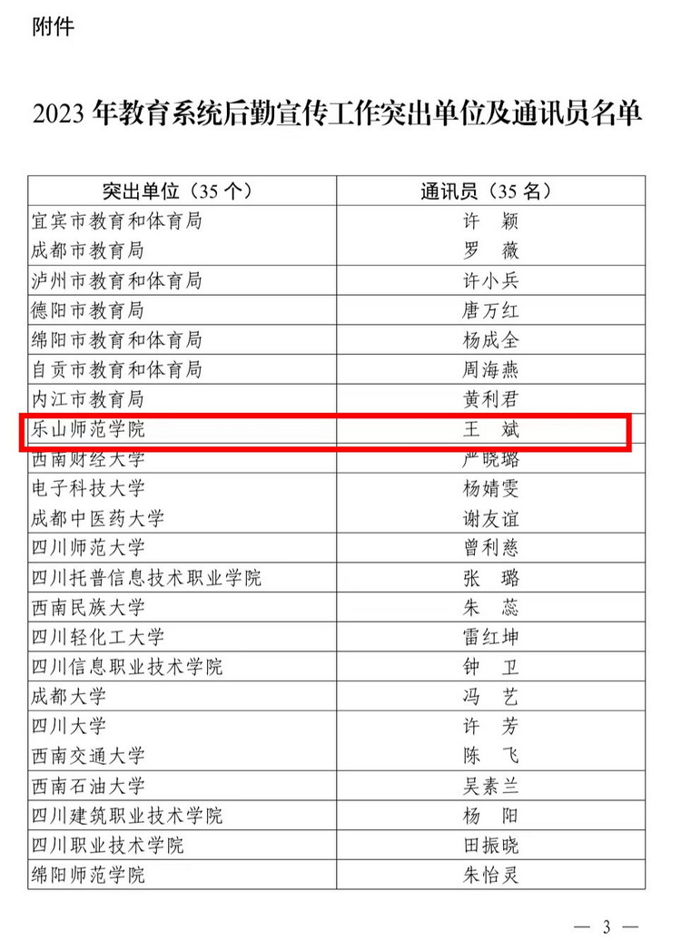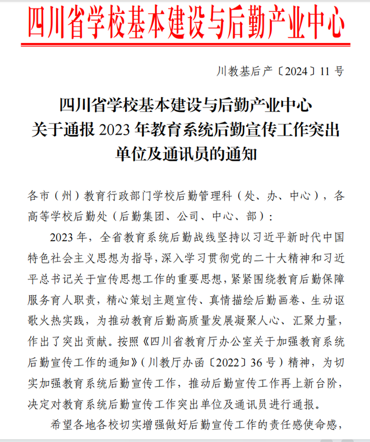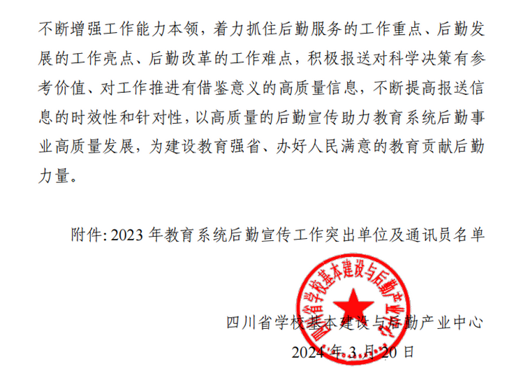 本网讯(文图/王斌)3月20日四川省学校基本建设与后勤产业中心在《关于通报2023年教育系统后勤宣传工作突出单位及通讯员的通知》(川教基后产[2024]11号)中对全省教育系统后勤宣传突出单位及通讯员进行表彰,我校被评为后勤宣传工作突出单位,综合科王斌被评为后勤宣传工作突出通讯员。