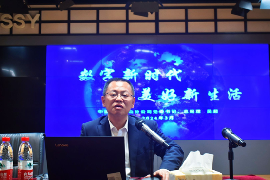 讲座中,吴超教授发表了以“数字新时代,美好新生活”为主题的学术报告,报告围绕新时代、新技术、新生活三个部分展开。他指出,在如今百年未有之大变局的时代背景下,实现中华民族伟大复兴的动力在于中国式现代化,并逐个解析了在推进中国式现代化创新发展过程中的发展生产力、解放生产力、保护生产力、新质生产力四大进程。在新技术方面,他围绕“基于数字技术的AI人工智能正引领社会变革”、“从固定程序指令下发到自我学习进阶进化”、“从‘+ AI’应用到‘AI+’驱动”等观点展开讲解。随后,他从中国移动的角度出发,明确指出中国移动作为国家队主力军在算力、算法、算力网络方面的人工智能布局。最后,他结合乐山移动自身情况表示,乐山移动作为人工智能布局的排头兵,将致力赋能百业、引领发展的战略。
