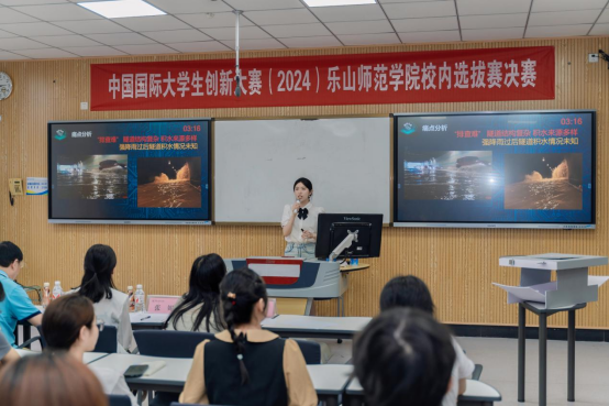 本网讯(文/赵家驹 张伊颖、图/何修)为培养学生创新意识、创新思维和创新能力,聚焦“五育”融合创新创业教育实践,激发青年学生创新创造热情,2024年6月6日下午,乐山师范学院中国国际大学生创新大赛(2024)校内选拔赛决赛在行知楼智慧教室隆重举行。乐山师范学院创新创业学院院长彭瑾、成都大学创新创业学院院长陈烈、万学教育集团总经理张莉、西安海荣机电设备有限公司总经理叶勇、成都康思德人力资源有限公司总经理张妮、经济管理学院郭美斌教授作为本次比赛评审专家出席活动,31支项目团队及教学院师生代表200余人参加了此次比赛。