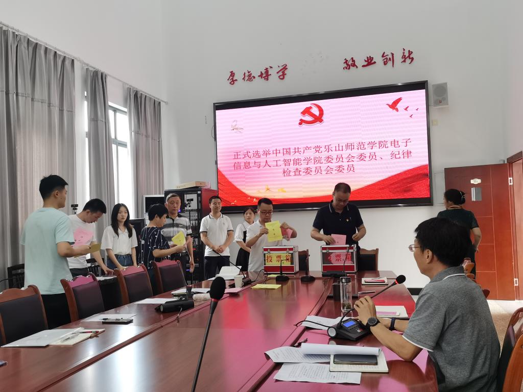 会上,全体与会党员审议并通过了《中国共产党乐山师范学院电子信息与人工智能学院党员大会选举办法》。大会严格按照《中国共产党章程》、《中国共产党基层组织选举工作暂行条例》、《中国共产党普通高等学校基层组织工作条例》的有关规定开展,在对学院两委选举的监票人、计票人名单等进行举手表决后,采取无记名投票的方式进行差额选举,从11名党委候选人中差额选出了9名党委委员,从4名纪委候选人中差额选出了3名纪委委员。蒋强、方忠、金澎、黄果、青海银、胡志惠、李敏、敬思远、常峰等9人当选为中共乐山师范学院电子信息与人工智能学院第一届党委委员;方忠、杨骏、祝加雄等3人当选为中共乐山师范学院电子信息与人工智能学院第一届纪委委员。