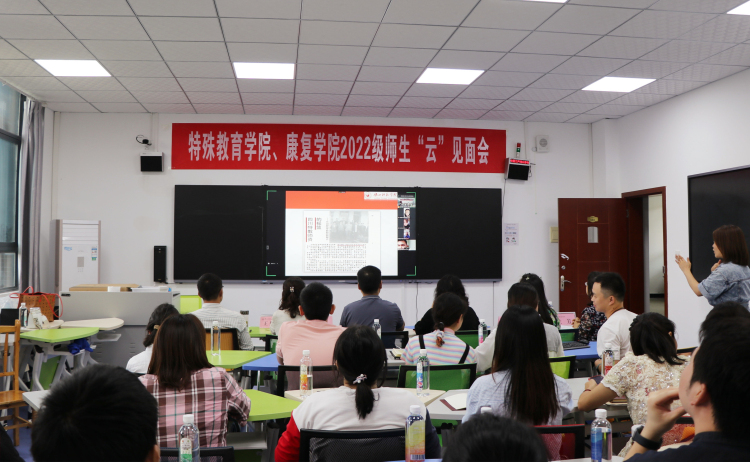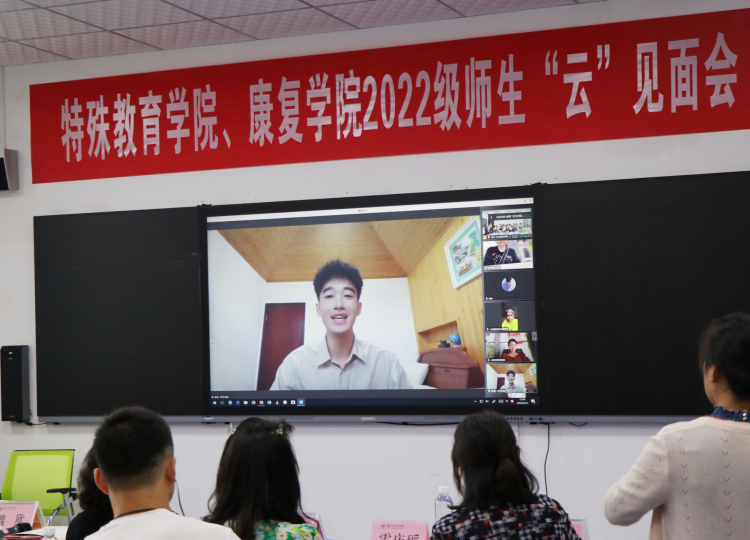 本网讯(文 图/尹馨媱)9月16日下午,特殊教育学院、康复学院2022级师生“云”见面会在特教大楼A503隆重举行,学院党委书记刘宗泉、院长张梅、党委副书记兰芳、副院长魏欣、院长助理王振洲出席会议,各年级辅导员、行政部门教师、2022级班主任及全体新生参加,此次见面会还特邀我院杰出校友雷庆瑶作为嘉宾出席。会议由兰芳主持。