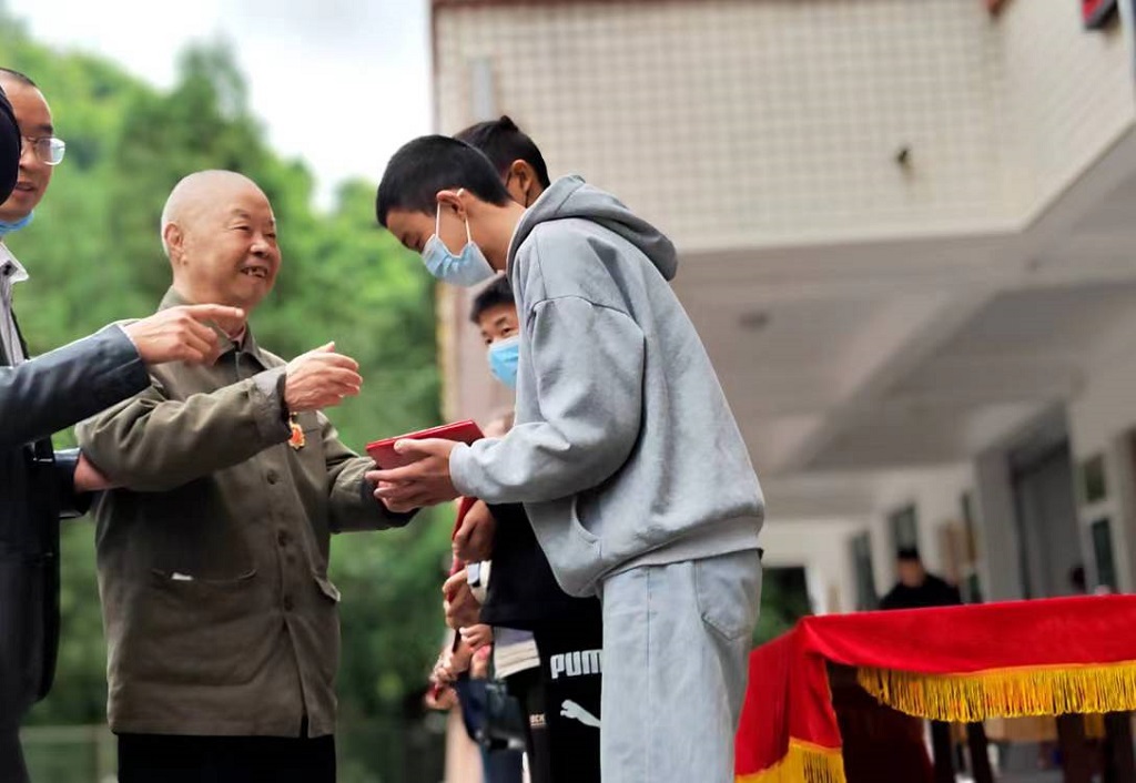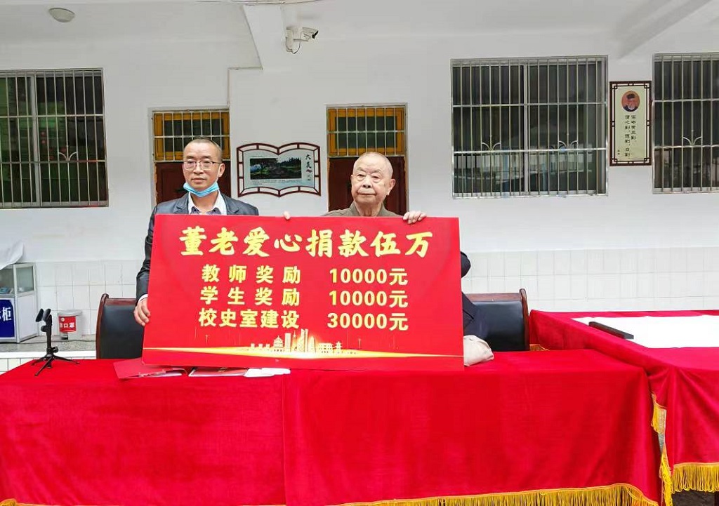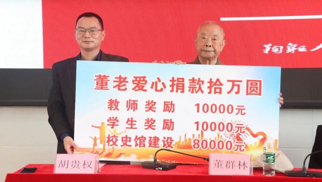 本网讯(文/王德明 图/董茂松)10月26日,我校94岁高龄的离休干部董群林同志在家人陪同下,到马边县马边二区中学(荍坝中学)参加了捐赠仪式,为马边二区中学的发展捐赠了人民币5万元,其中3万元用于学校校史建设,1万元用于教师奖励,1万元用于学生奖励。