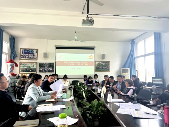 本网讯(文、图/吴雨洁)为进一步加强学院内涵建设,提高全体教职工对绩效考核是学院发展的指挥棒和方向标的重要认识,推动学院各项工作高质量发展,3月16日下午,文新学院召开“对标竞进,争创一流”专题教职工政治理论学习会。学院全体教职工参加会议,会议由文新学院党委书记彭杨主持。