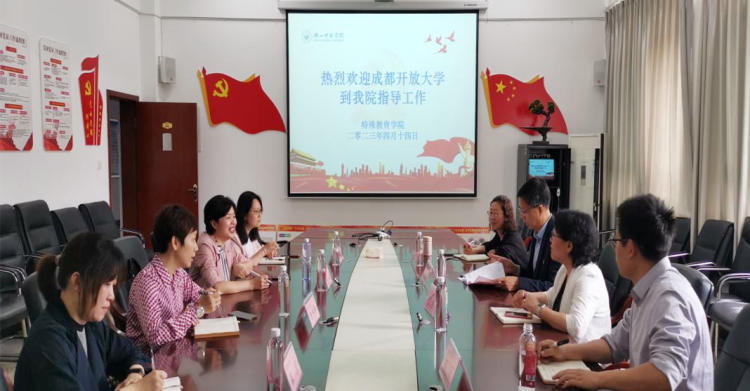 张梅介绍了特殊教育学院的发展现状、专业建设成效和残疾人高等教育建设情况。陈琳高度赞扬了特殊教育学院办学所取得的各种成效,介绍了成都开放大学开展残疾人教育的基本情况以及发展远景。双方围绕校地合作、科研项目合作、家长学校建设、社区教育和培训项目等内容进行了广泛深入交流。