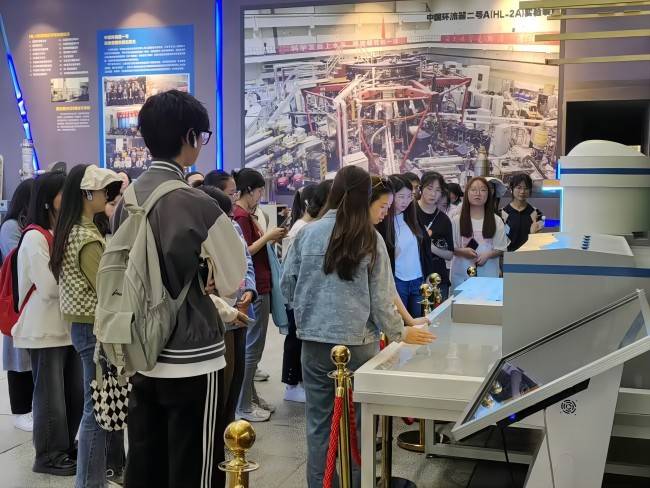 在中国第一座“人造太阳”实验装置中国环流器一号前,在场师生了解了老一辈核工业人为响应国家“三线建设”,扎根山区,投身科研、艰苦创业的故事,除此以外,馆内还收藏有微型环流器装置、返场箍缩环流器装置、预试环流器装置等当年的实验装置和仪器设备等珍贵展品。在参观过程中,大家一方面感慨和聚变发展过程的艰辛与不易,另一方面更感受到祖国的进步。