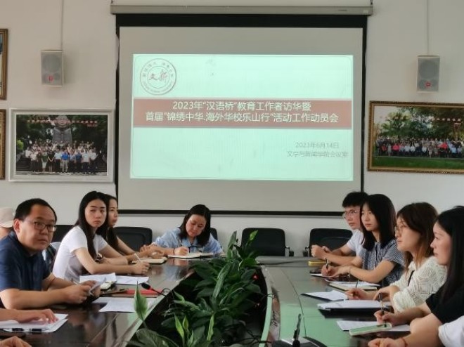 本网讯(文图/曾悦) 6月14日,为顺利执行教育部语言合作交流中心“汉语桥”教育工作者访华团项目,国际合作与交流处与文新学院在学院会议室举行了"汉语桥"教育工作者访华暨首届"锦绣中华·海外华校乐山行"活动的工作动员会。国际合作与交流处处长于科先,文新学院院长刘传启,学院党委副书记、纪委书记胡平建,以及项目师生团队参加了动员会。动员会由学校专职组织员杨泽勇主持。