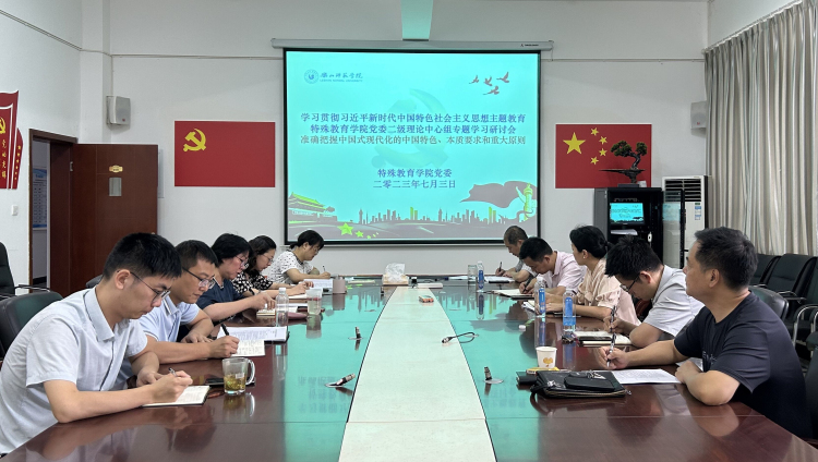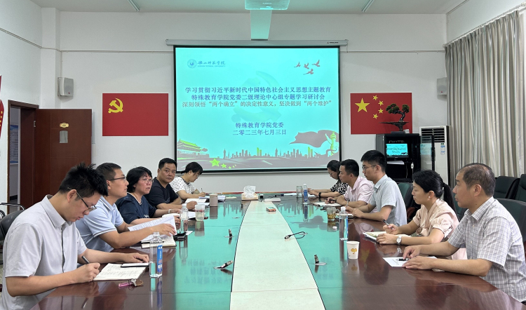 本网讯(文 图/张敏)7月3日,特殊教育学院党委在特教大楼A-408会议室,举行了二级理论中心组学习贯彻习近平新时代中国特色社会主义思想主题教育7月专题学习研讨会,学院全体处科级干部、科级岗位工作人员参加了学习研讨,学习研讨会由学院党委书记刘宗泉主持。