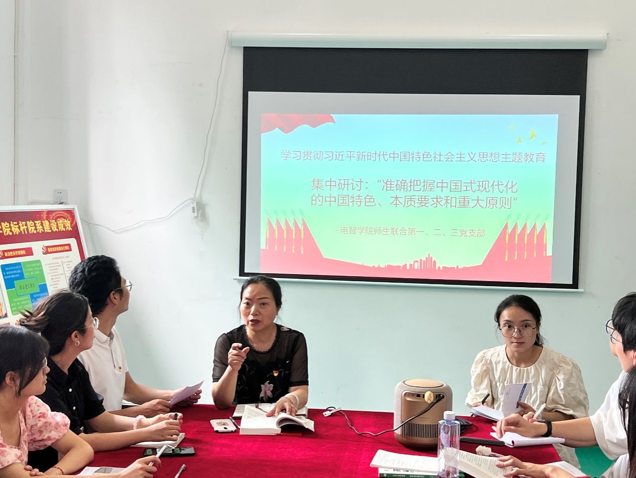 本网讯(文/余旺 图/陆奥宇)为了进一步学习贯彻习近平新时代中国特色社会主义思想主题教育,电子信息与人工智能学院师生联合第一、二、三党支部于7月1日下午在特教C502举办了“准确把握中国式现代化的中国特色、本质要求和重大原则”的集中研讨会,此次研讨会由电智学院师生联合第二党支部书记谭红梅主持,参会人员有学院师生联合第三党支部书记肖苗以及师生联合第一、二、三党支部全体党员。