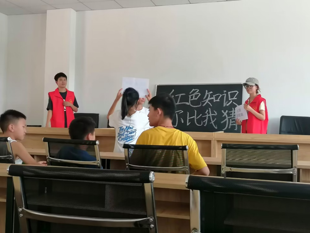 活动中,唐菀、郑宇等志愿者将孩子们分成两人一组进行猜词游戏。孩子们情绪高涨,踊跃参与游戏,一人将看到的词语含义通过肢体语言或在不包含答案字词的情况下用适当的形式表达出来,让另一人猜答案。无论是《没有共产党就没有新中国》《十送红军》等经典歌曲,还是王二小、黄继光、邱少云等英雄人物,都在游戏中潜移默化地影响孩子们,让红色知识深入孩子们的心灵。