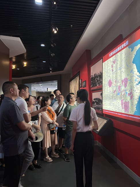 接着到达湖南通道转兵纪念馆,在这里,老师们了解到该馆整个陈列布展分战略转移、通道转兵、走向胜利、红色印记四大板块,围绕“缅怀革命先烈、传承长征精神”这一主题,采用了图文、绘画、雕塑、沙盘、声光电、情景复原等手法,真实客观地再现了红军长征“通道转兵”这一辉煌历史。1934年12月,中国工农红军长征途径湖南通道,召开了通道会议,决定转道贵州。通道转兵,是实现长征伟大转折的开端。