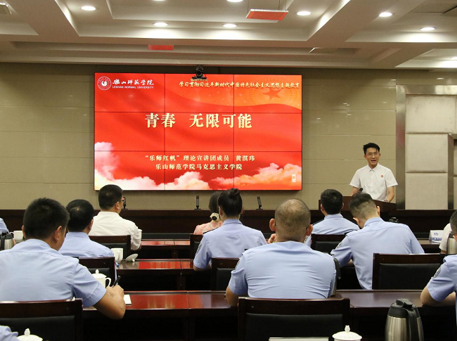 本网讯(文/黄淇玮 图/乐山新闻网)7月19日,由中共乐山市委宣传部、市委讲师团联合主办的“学习二十大 奋进新征程”“乐讲习语”乐山市基层理论宣讲活动在乐山市公安局举行。马克思主义学院“乐师红帆”理论宣讲团成员黄淇玮参加此次宣讲活动。
