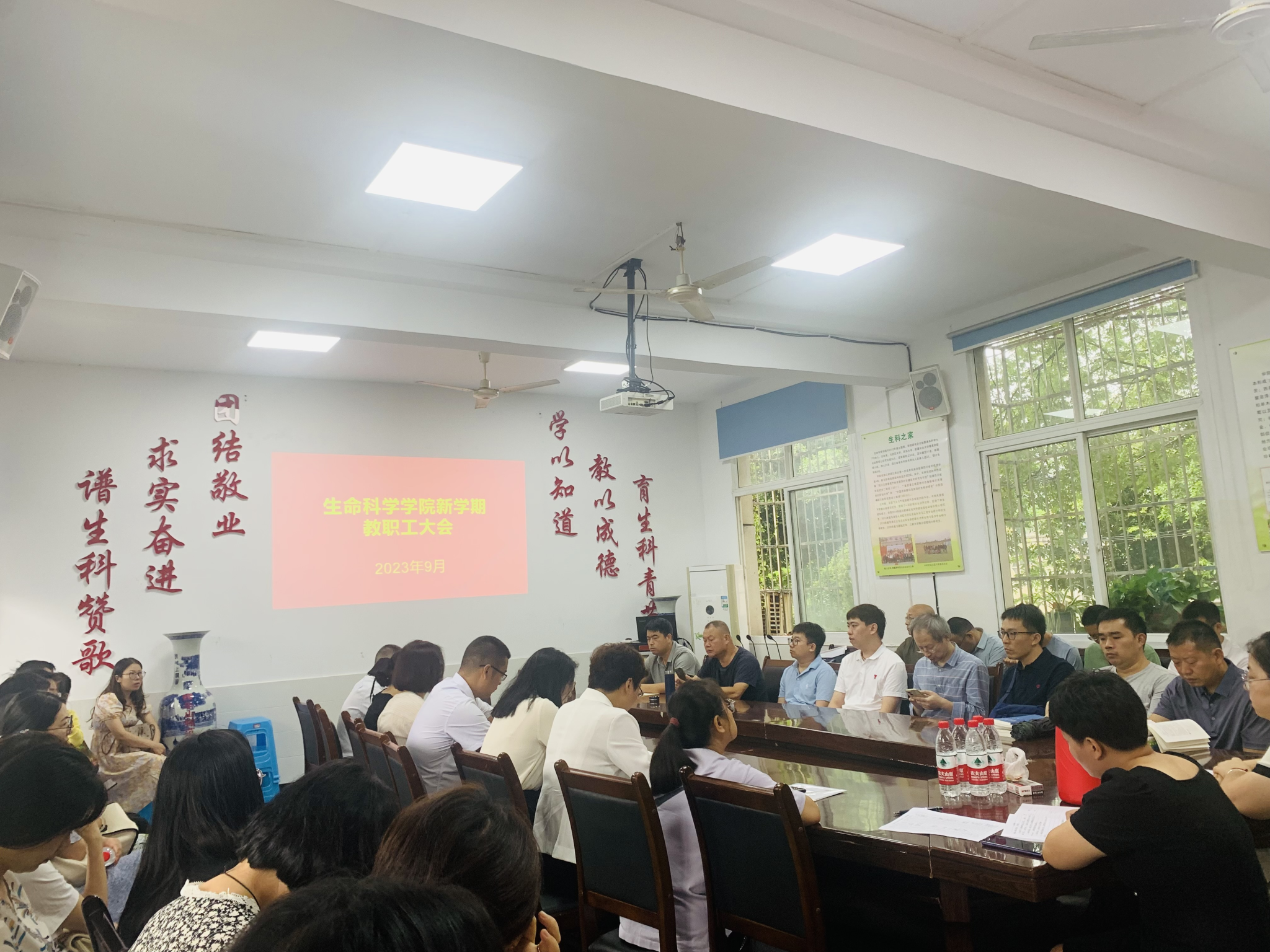 本网讯(文图/罗旭)9月1日上午,生命科学学院在博雅楼一楼会议室召开本学期第一次教职工大会,学院全体教职工参会,会议由学院党委书记杨益主持。