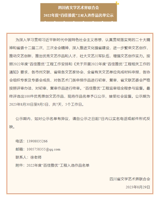 本网讯(文图/吴胜景)据悉,刚刚结束的四川省文学艺术界联合会2022年度“百佳推优”工程选拔活动入选名单已经公布,我校美术与设计学院副教授吴胜景博士经过层层选拔,最终入选了四川省文学艺术界联合会2022年度“百佳推优”工程,也成为乐山市仅有的两件入选作品之一。