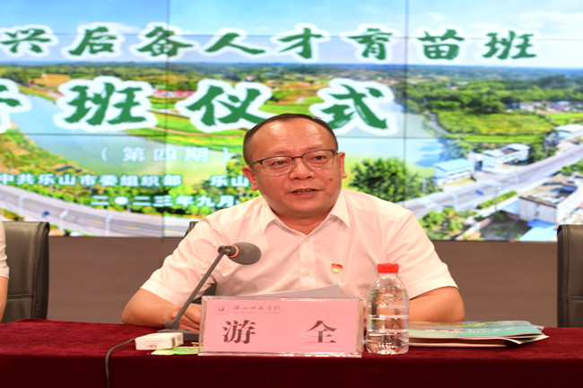 游全从“为什么要举办‘育苗班’”、“在‘育苗班’能学到什么”与同学们作交流,从国家大政方针、乐山现代化建设、学生未来发展三个方面充分阐释了“育苗班”的重要意义,同时介绍了“理论学习+实践锻炼+顶岗实习”的教学模式,并希望全体学员潜心学习、志存高远、永葆情怀、严格自律,在学习中不断提升自己,为乡村振兴贡献智慧力量。