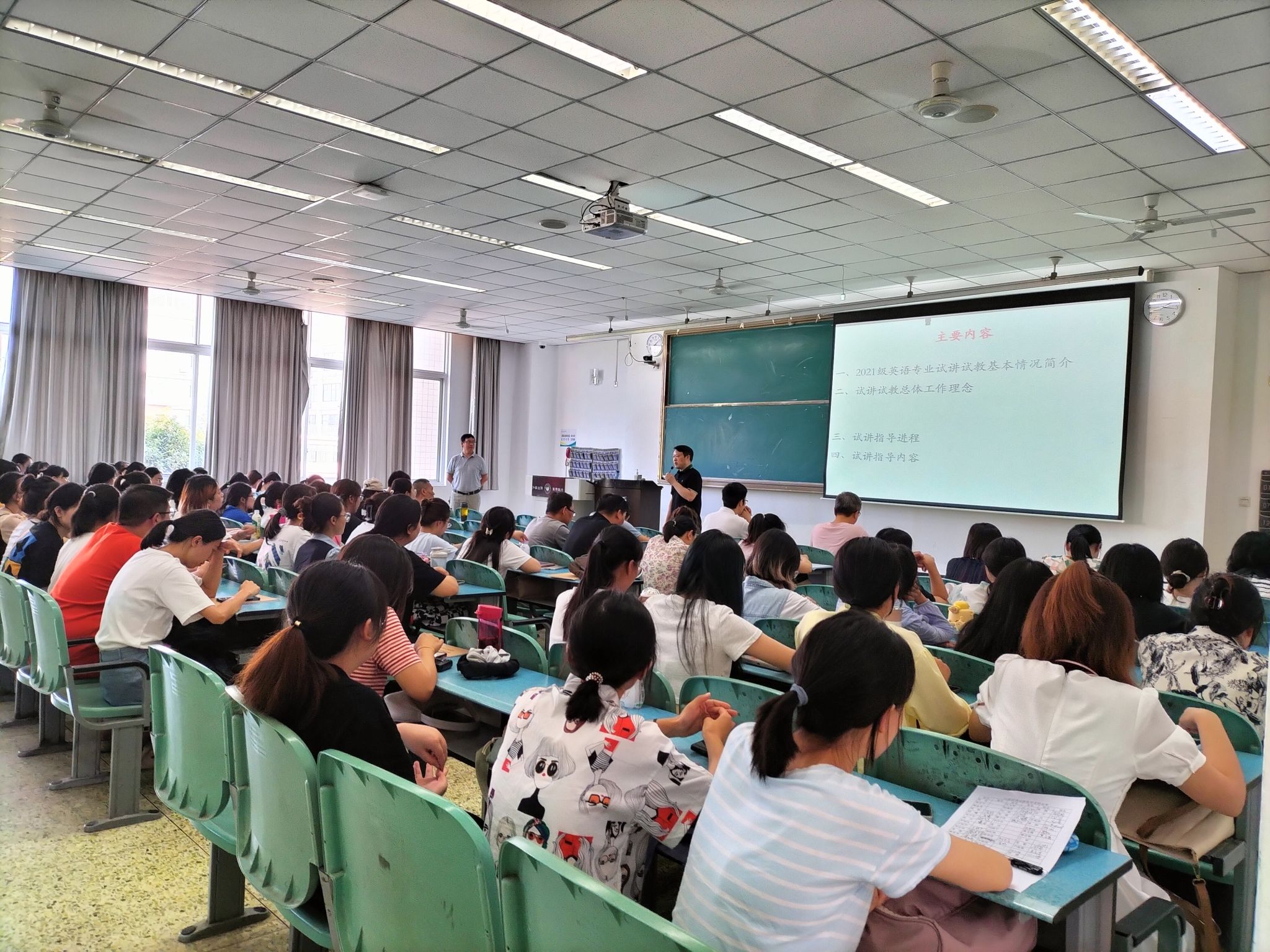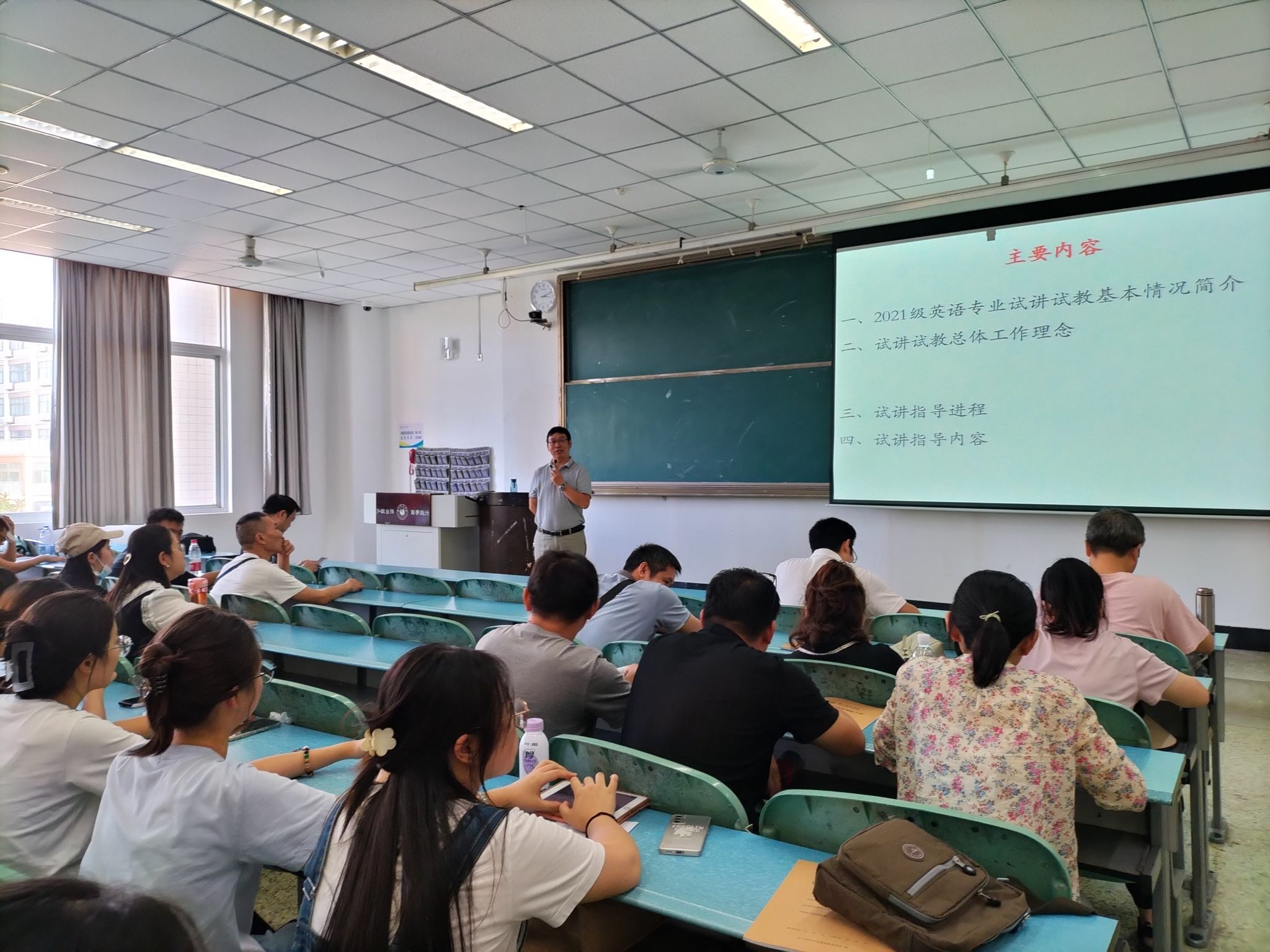 本网讯(文王柯芦/图景爱民)9月14日下午,外国语学院在行知楼225教室举行了2021级英语专业试讲试教培训会。外国语学院院长江世勇、副院长陈开富、试讲试教指导教师和2021级英语专业全体学生参加了本次培训会。