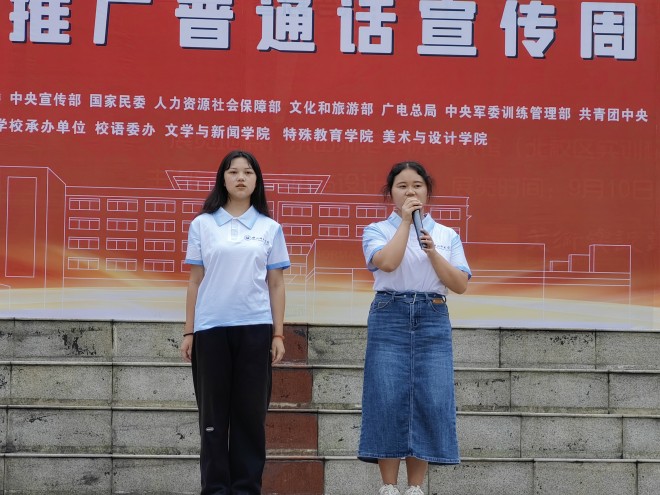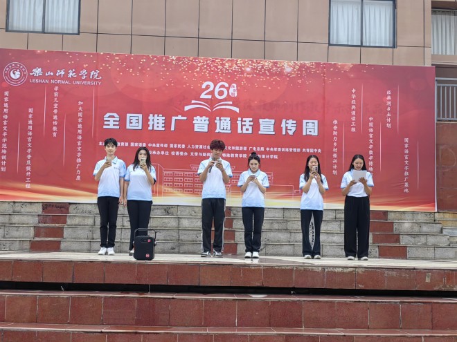 本网讯(文/何诗睿、李貞霖 图/付欣怡、毛伊璇、李顺)悄然凉意起,辞夏迎新秋。在这秋风送爽,金桂飘香的季节里,为进一步加强全校师生的语言规范意识和推广普通话的参与意识,加强国家通用语言文字教育同时推动全校语言文字工作的纵深发展,九月推普周,由乐山师范学院文学与新闻学院主办,特殊教育学院协办的“推广普通话,奋进新征程”主题活动于桂花广场正式举行。学校语委办主任罗明礼教授、教师教育学院杨小丽科长、文学与新闻学院党委书记彭杨,文学与新闻学院辅导员蔡光军老师出席活动。