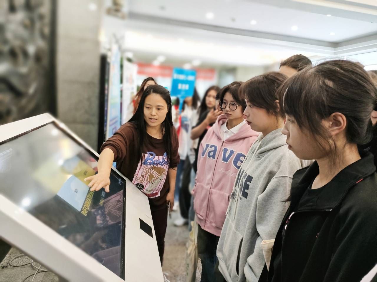 在图书馆五楼学术报告厅信息服务部的老师向新同学作了《图书馆资源与利用》的讲座培训,介绍了图书馆的基本概况、图书馆规章制度和电子资源的使用方法等。在读者服务部老师和学生志愿者的带领下,一批批新生陆续现场体验怎样使用自助查询机、自助借还机、电子书借阅机等现代化自助设备,并实地参观了数字阅读与新技术体验空间。