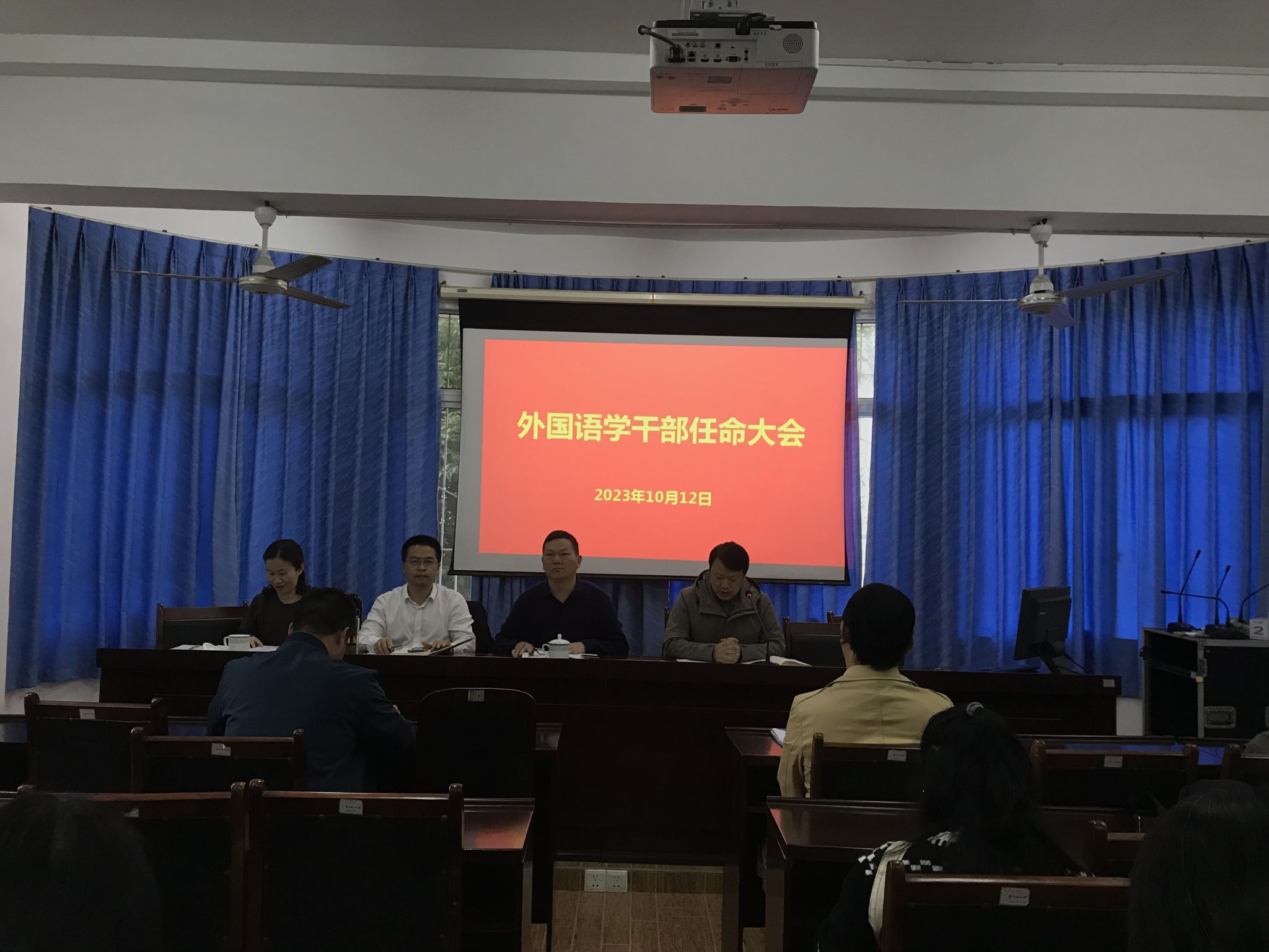 本网讯(文/唐爱苹 图/雷洪敏)10月12日下午,外国语学院在一楼会议室召开干部任免大会。学校党委常委、纪委书记彭尚源、组织部副部长周琴代表学校参会。大会由外国语学院院长江世勇主持。