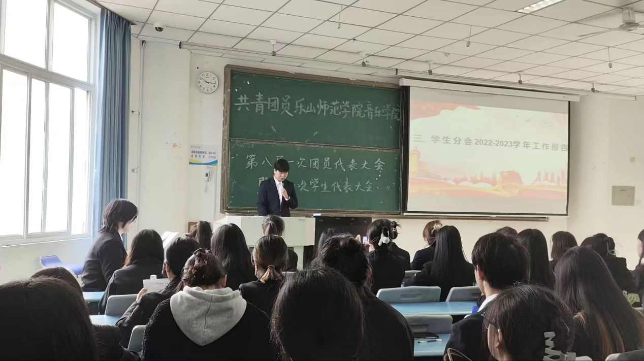 本网讯(文/何沁颐 图/谭悦、凌宇婷)为了认真总结我院共青团工作,促进学院共青团的自身建设,更好地发挥共青团在思想政治教育和日常管理中的作用。根据《团章》和《学生会章程》的有关规定,经学院党委、校团委的批准同意。乐山师范学院音乐学院第八届一次团员代表大会暨第十次学生代表大会于2023年11月25日上午10:00在行知楼314教室召开。音乐学院学院党委副书记、纪委书记余友情、20级、21级辅导员郭元红、22级辅导员张玉莲、23级辅导员周琼怡以及音乐学院学生干部团员及班级代表们参加本次会议,大会由第七届分团委副书记韩笑主持。