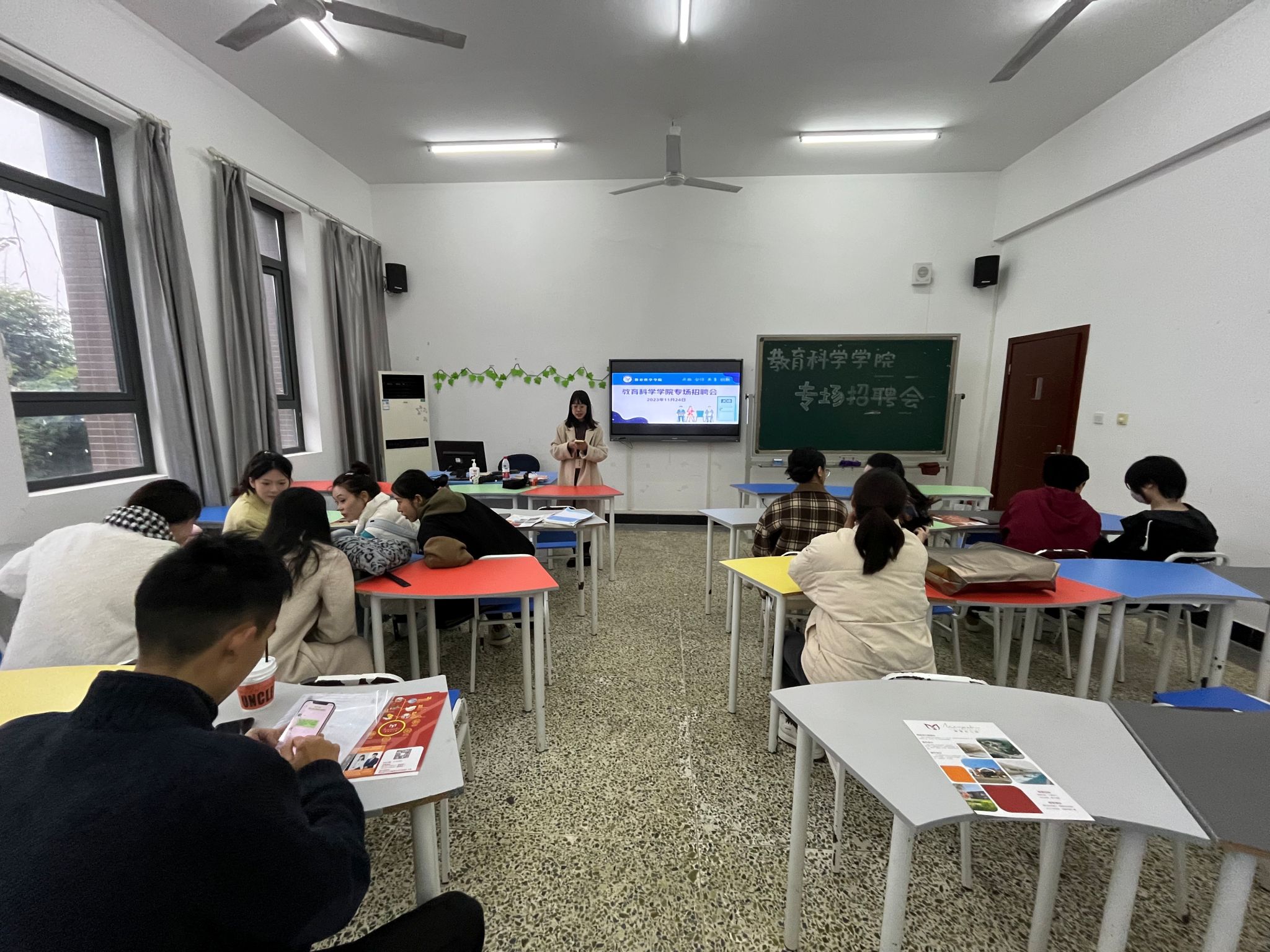 本网讯(文、图/邓萱)11月24日,教育科学学院在特教B栋305、403教室举行了“学前教育专业专场招聘会”,本次招聘会主要面向2024届学前教育专业毕业生以及其他有意愿的学生,学院邀请了峨眉萌智幼儿园和成都小童星幼儿园的招聘老师到院宣讲,有近三十名学前教育专业的学生参加此次专场招聘会。