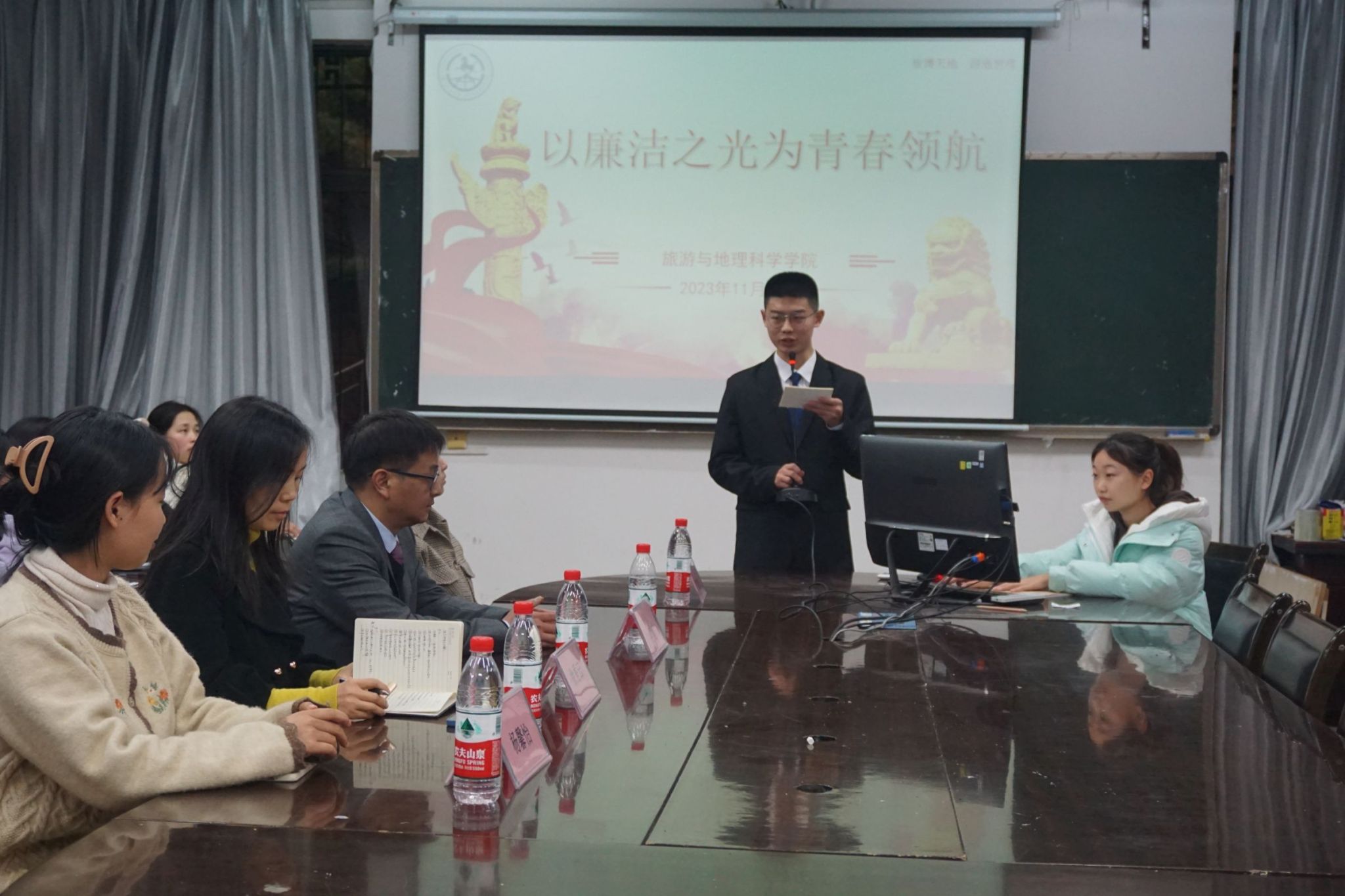 本网讯(文/林海珍 图/卿婷)11月30日下午,旅游与地理科学学院在旅院楼102室举行了“以廉洁之光为青春领航”法治作品竞赛颁奖典礼,并开展了廉洁诚信教育。学院党委书记徐秀云,党委副书记、纪委书记冉勇,21级、22级辅导员郑曾俊,辅导员助理杨馨怡,学院法治作品竞赛获奖选手和主要学生干部参加了本次活动。