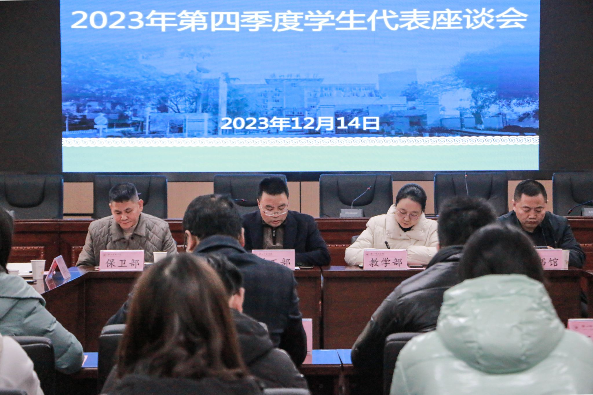 (本网讯文/郑新美、起兆熠 图/张莉琴)2023年12月14日下午,党委学生工作部联合校团委、教学部、图书馆、后勤保障服务部、党委武装保卫部、信息技术与实验保障处、师科公司、体育学院,和各教学院30名学生代表在弘毅楼第三会议室召开第四季度学生代表座谈会。会议由党委学生工作部副部长胡平建主持。