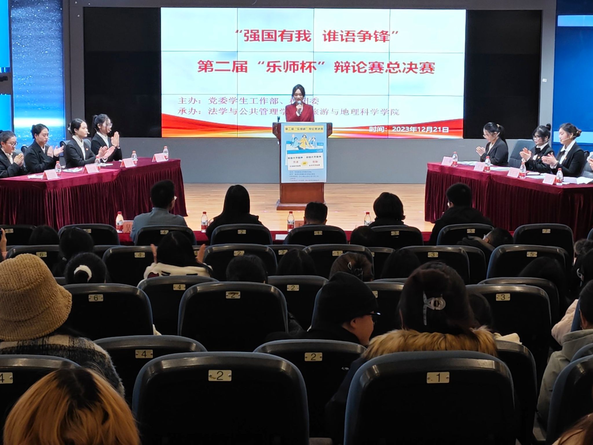 本网讯(文/江琳 图/李思嘉)为全面贯彻党的二十大精神,落实立德树人根本任务,提升学生自主思考能力与创造能力,营造浓厚的思辨氛围,展示昂扬向上、敢于辩驳的青春风采,由党委学生工作部、校团委主办,法学与公共管理学院、旅游与地理科学学院共同承办的第二届“乐师杯”辩论赛决赛于12月21日在旷怡楼一教八阶学术报告厅进行。本次辩论赛由校团委副书记翟雅媛、特殊教育学院、康复学院党委副书记兰芳、法学与公共管理学院副院长赵勇、经济管理学院吴耀国博士、文学与新闻学院辅导员樊磊担任评委。校团委书记李东,党委学生工作部副部长胡平建,各教学院党委副书记、辅导员们作为嘉宾出席本次决赛。