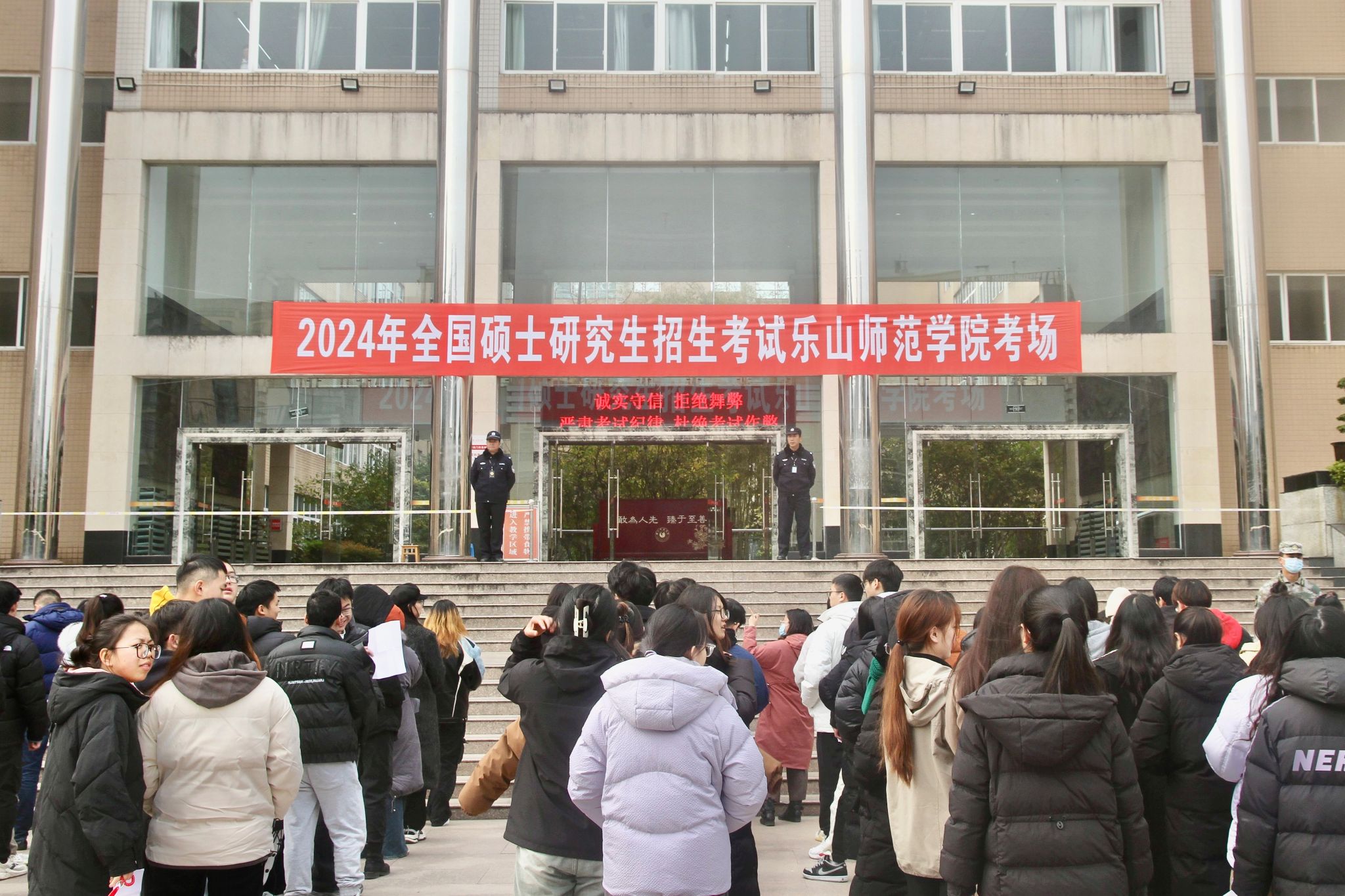 此次考试,历时近一个月,共出动学校校卫队、乐山市公安局、政保支队、交警一大队、市中区公安分局海棠派出所、军事特长生等单位人员近80余人,全体工作人员不畏严寒、尽心履职,有力地维护了考场秩序安全有序,圆满完成了2024年全国硕士研究生招生考试我校考点安保工作任务。