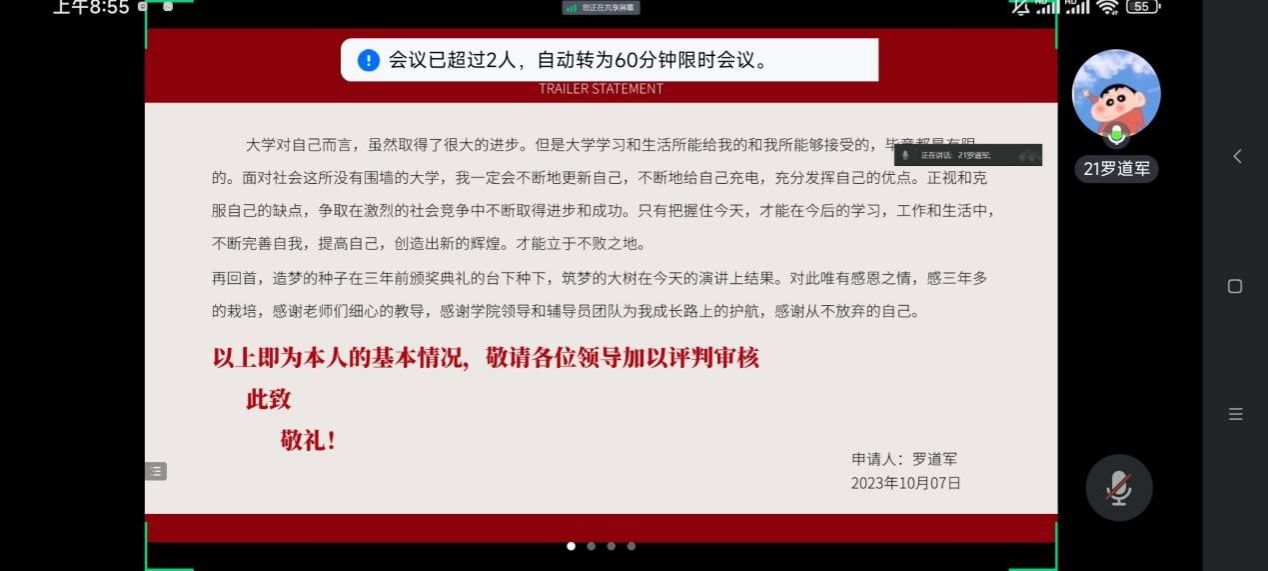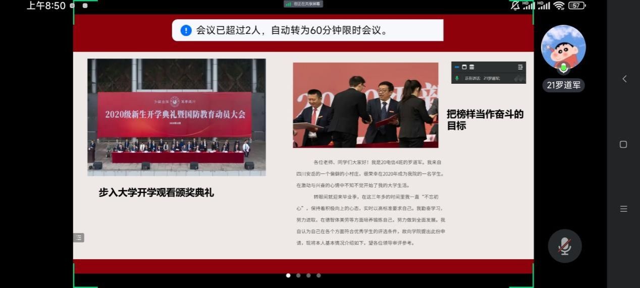 评选开始,主持人宣读本次评选的规则,要求参评人自立自强,积极进取,在学习成绩、学生工作等方面表现突出。紧接着两位候选人李梦瑶和罗道军,通过PPT展示了家庭情况、学习成绩、实践活动等多个方面的具体情况。在两位候选人展示结束后,评委们通过线上程序对两位候选人具体情况以及现场表现进行评分。经过评分计算,最终决定由李梦瑶获得大学生自强之星的荣誉。