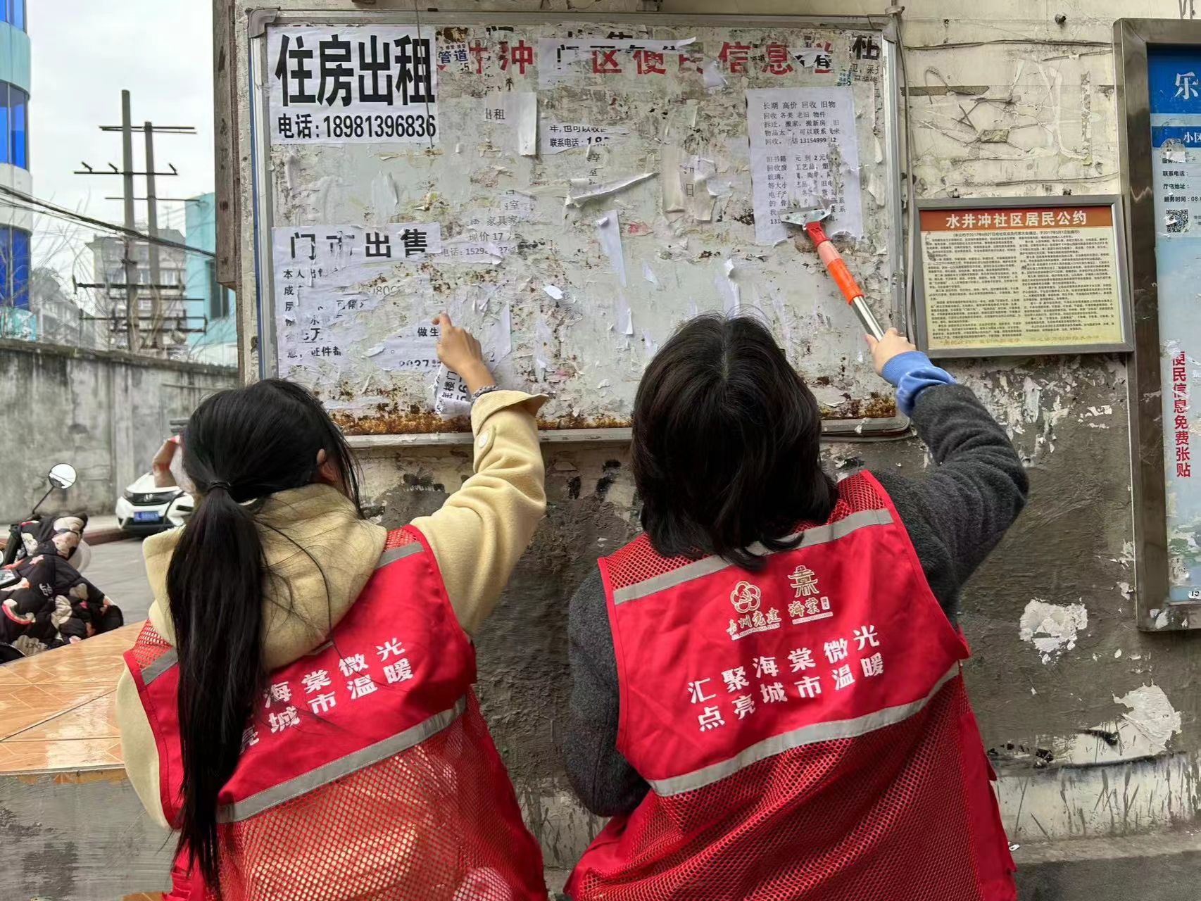 在海棠街道办下辖的水井冲社区,校青志中心和美设学院青年志愿者在社区工作人员的指导下,多维度进行社区日常志愿服务:他们维持马路秩序,他们发放环保宣传资料,他们对广告乱乱张贴,共享电瓶车违规放置进行清理,他们为居民免费修剪头发、测量血压等,身体力行践行雷锋同志“为人民服务”的精神。