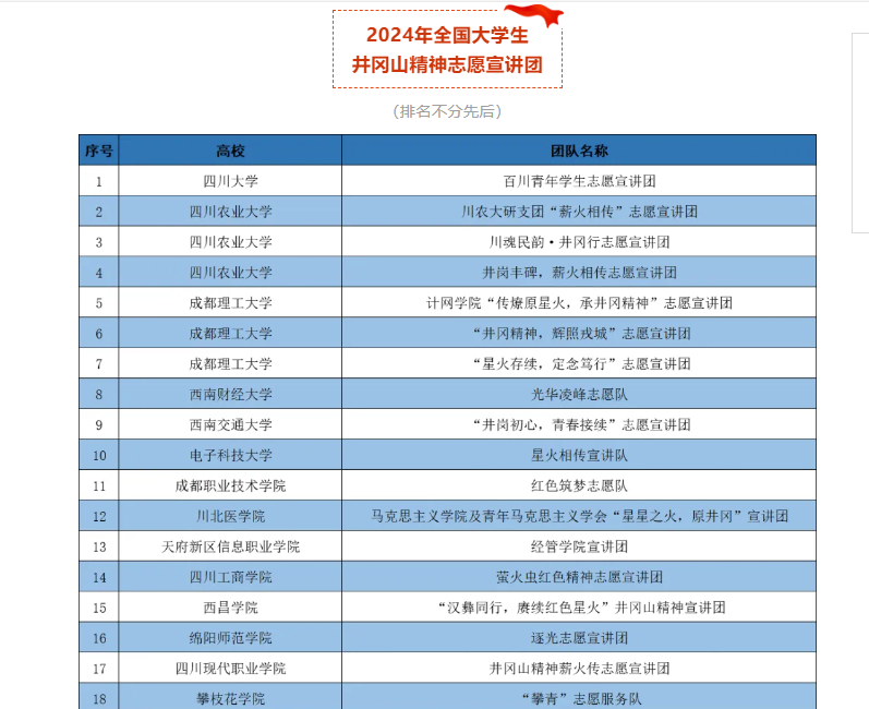 本网讯(文/罗梦瑶 图/中国青年志愿网)为深入学习宣传贯彻习近平新时代中国特色社会主义思想和党的二十大精神,落实“强国复兴有我”群众性主题宣传教育活动相关要求,引导动员青年学生大力弘扬井冈山精神,团中央青年志愿者行动指导中心、全国青少年井冈山革命传统教育基地管理中心联合发布了《关于遴选2024年全国大学生井冈山精神志愿宣讲团的公告》,乐山师范学院马克思主义学院“乐师红帆”理论宣讲团积极响应号召,组建队伍,进行申报并成功入选2024年全国大学生井冈山精神志愿宣讲团。根据安排,“乐师红帆”理论宣讲团将在第一阶段(5月)进行研学;在第二阶段(5-7月)以井冈山精神为主要宣讲内容,结合党的二十大精神,面向校内二级学院、校外社区、村镇、中小学课堂等阵地,以公开演讲、主题团日活动以及与音乐表演相结合等方式开展宣讲;在第三阶段(7-8月)进行总结。