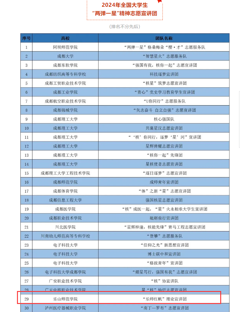 与此同时,为深入学习宣传贯彻习近平新时代中国特色社会主义思想和党的二十大精神,落实“强国复兴有我”群众性主题宣传教育活动相关要求,纪念中国第一颗原子弹成功爆炸60周年,引导青年学生大力弘扬“两弹一星”精神,团中央青年志愿者行动指导中心、中国核工业集团有限公司近日联合发布了《关于遴选2024年全国大学生“两弹一星”精神志愿宣讲团的公告》。乐山师范学院马克思主义学院“乐师红帆”理论宣讲团也积极响应号召,组建队伍,进行申报并成功入选2024年全国大学生“两弹一星”精神志愿宣讲团。